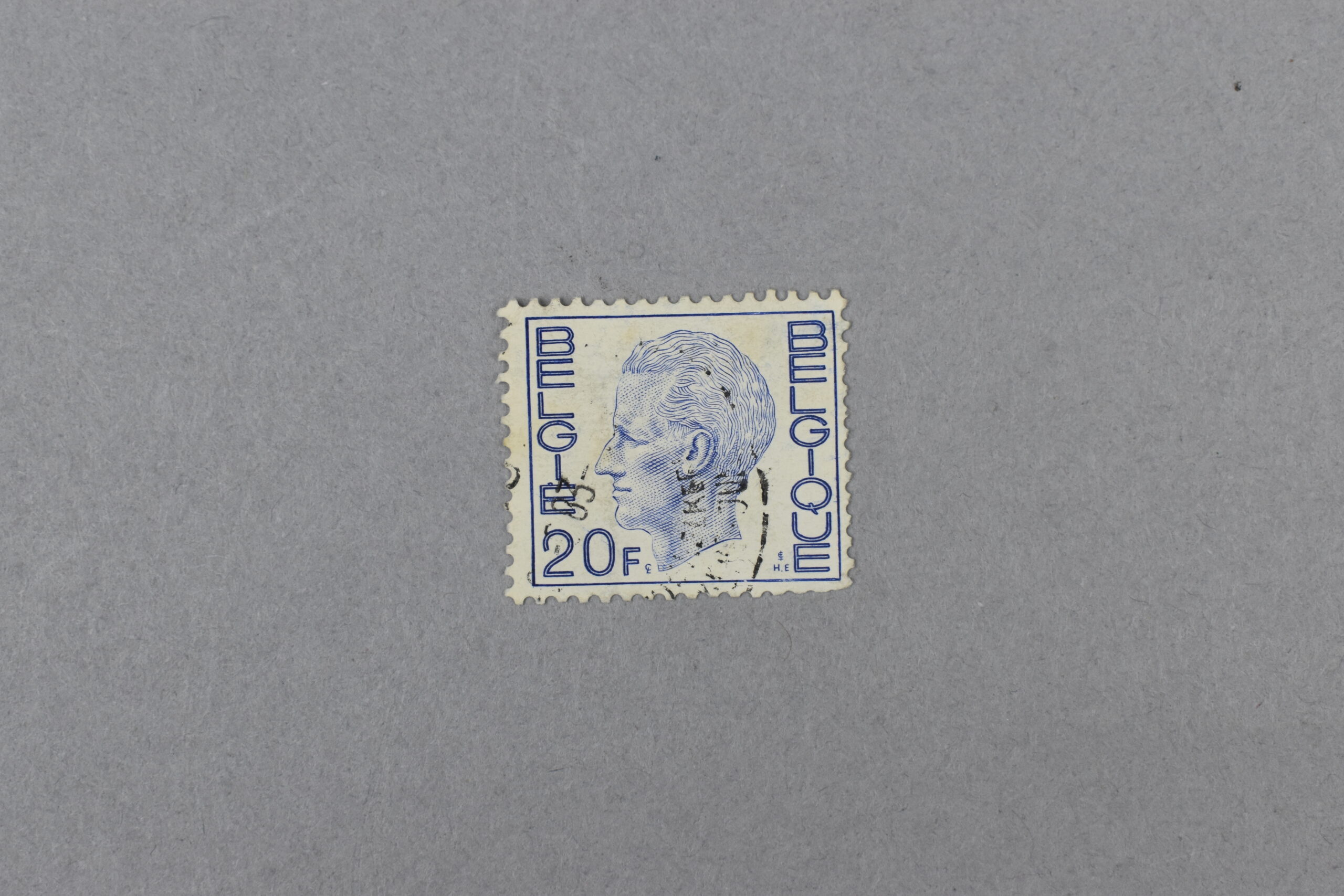 Estampilla de color azul que muestra en su interior el retrato en color morado de perfil izquierdo del Rey de los Belgas: Balduino de Bélgica (1930-1993), quién reinó desde el año 1951 hasta su muerte en 1993. Se puede apreciar el nombre del país en dos idiomas, en neerlandés: «België» y en francés: «Belgique».