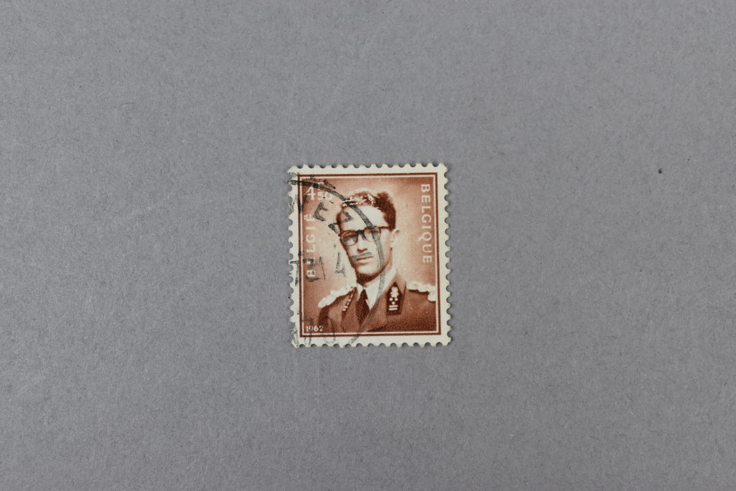Estampilla de que muestra en su interior una fotografía de color gris del Rey de los Belgas: Balduino de Bélgica (1930-1993) en uniforme militar, quién reinó desde el año 1951 hasta su muerte en 1993. Se puede apreciar el nombre del país en dos idiomas, en neerlandés: «België» y en francés: «Belgique».