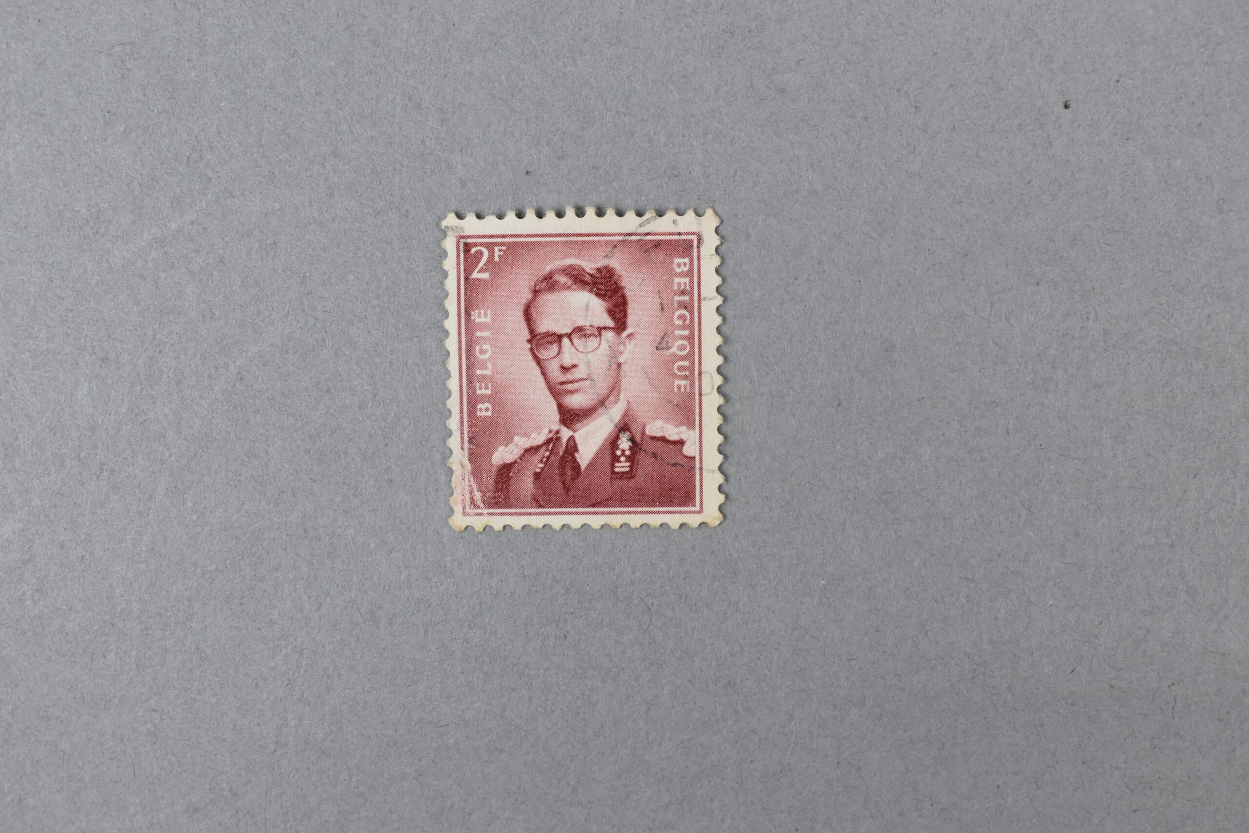 Estampilla de que muestra en su interior una fotografía de color gris del Rey de los Belgas: Balduino de Bélgica (1930-1993) en uniforme militar, quién reinó desde el año 1951 hasta su muerte en 1993. Se puede apreciar el nombre del país en dos idiomas, en neerlandés: «België» y en francés: «Belgique».