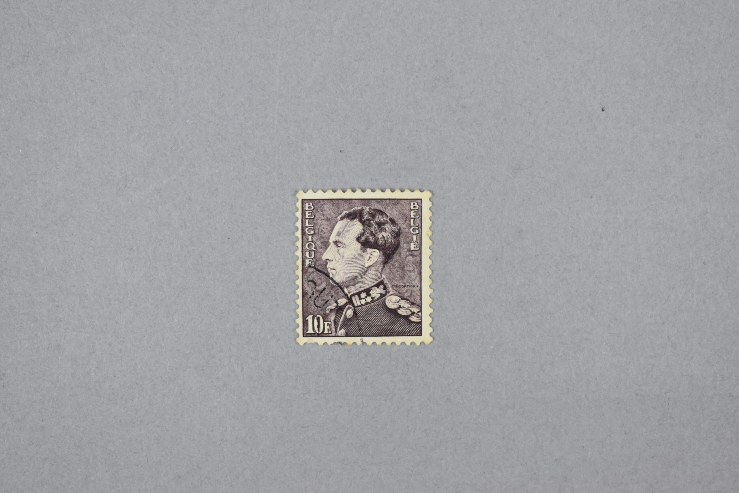 Imagen del perfil izquierdo del Rey Lepoldo III de Belgica en traje militar con las palabras «BELGIE» y «BELGIQUE» a su costado, así como el valor de 10 F en la parte inferior, todo en color marrón oscuro