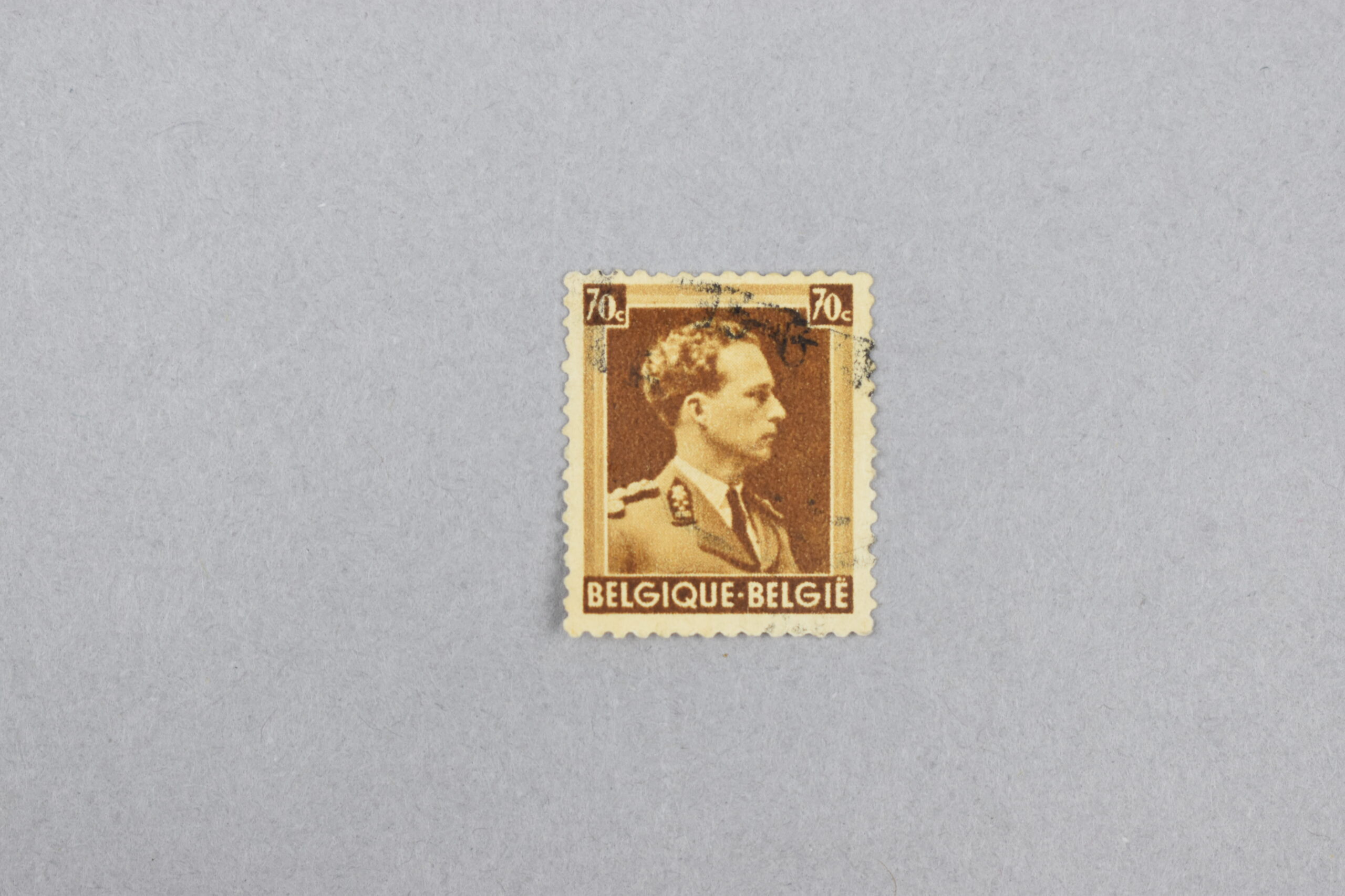 Fotografía del perfil derecho del Rey Leopoldo III de Bélgica, con las palabras «BELGIQUE» y «BELGIE» en la parte inferior y el valor de 70C duplicado en la parte superior, todo enmarcado en un diseño cuadriculado y en color marrón claro.