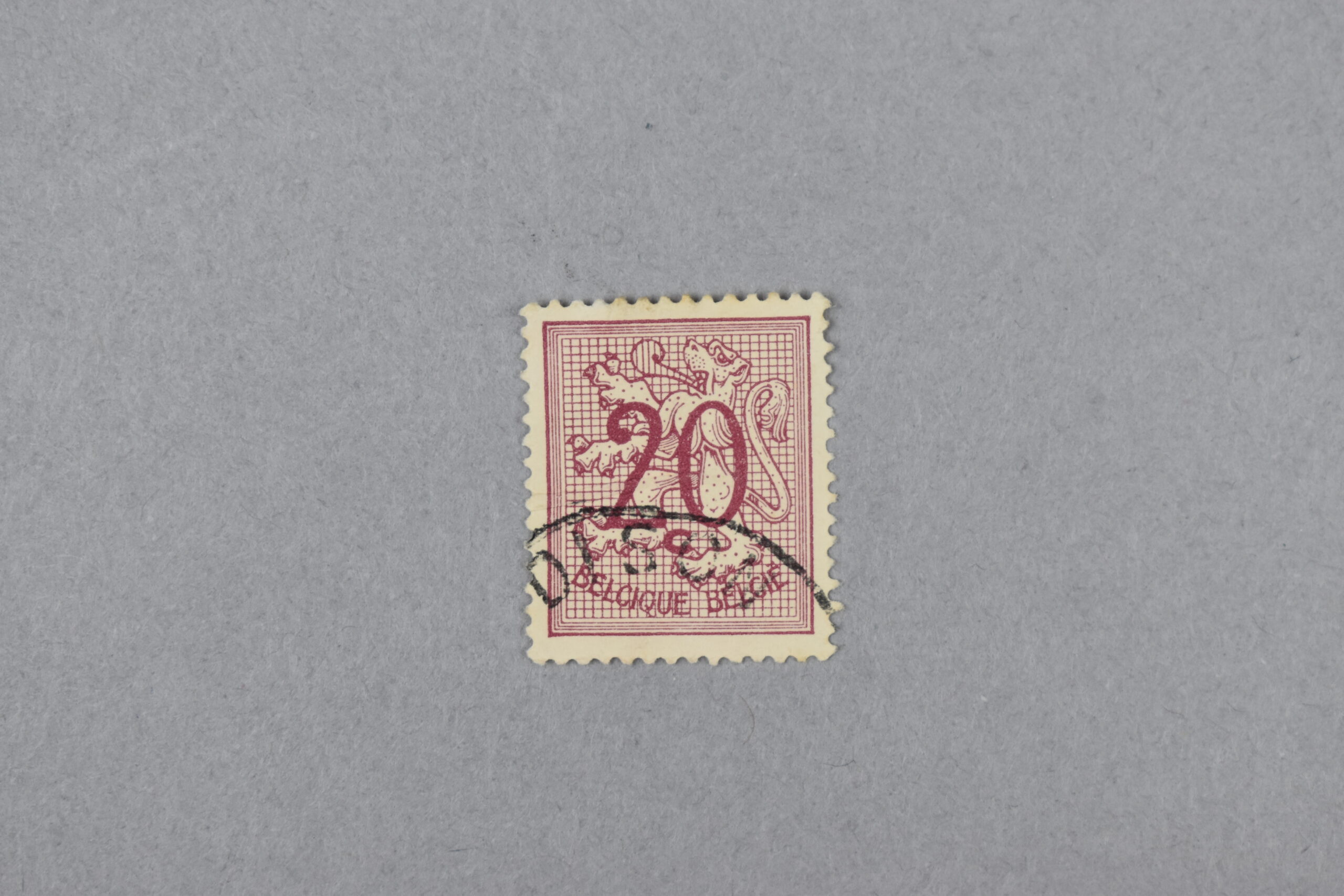 León rampante, armado y lampasado con un numero 20 c por delante y con las palabras «BELGIQUE» y «BELGIE» en la parte inferior todo en un fondo de cuadricula y todo de color guinda.