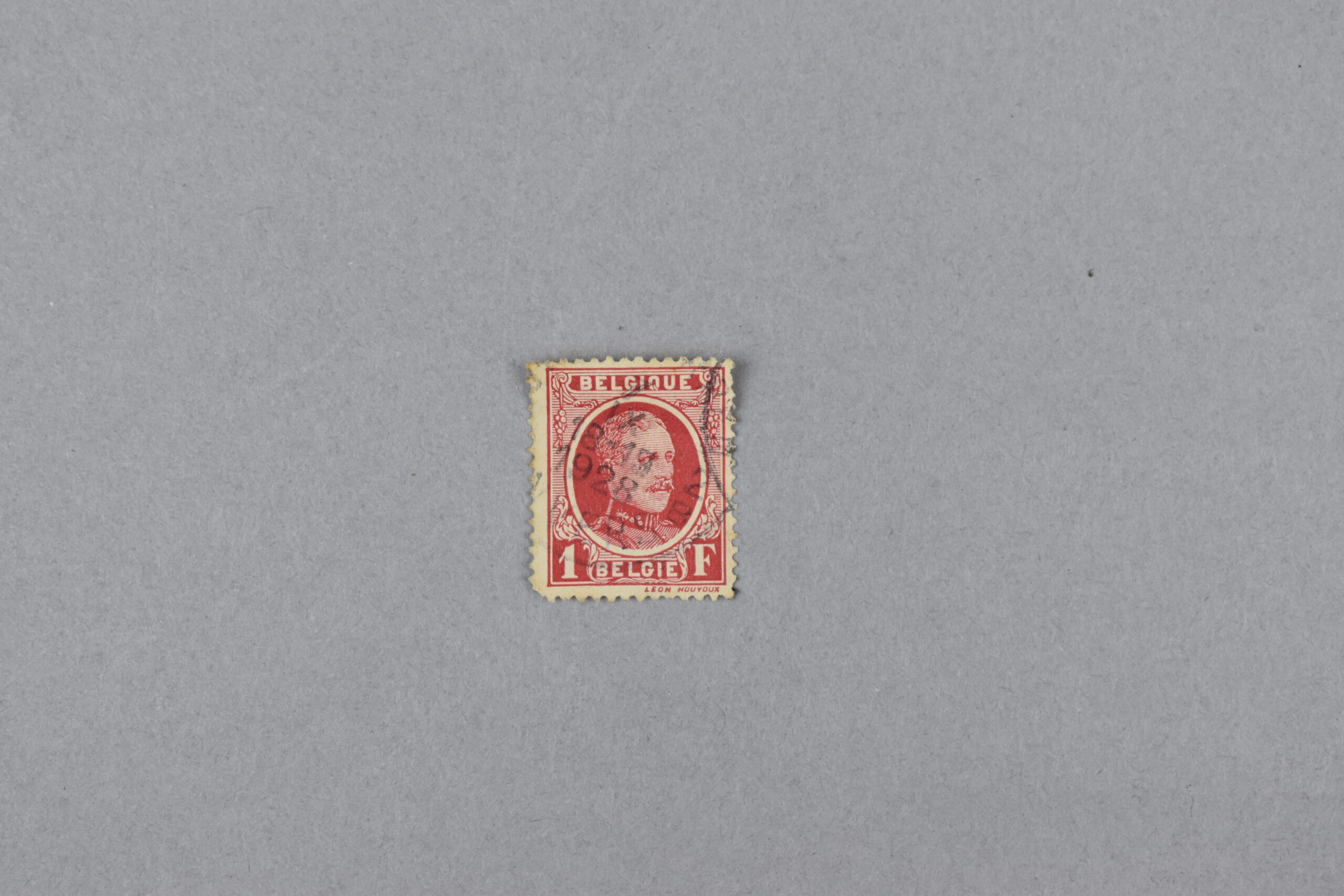 Retrato de Alberto 1 de Bélgica en un fondo ovalado que se encuentra sobre un fondo adornado con las palabras BELGIQUE en lo superior y BELGIE en lo inferior, con el numero 1 en una esquina y la F en la otra. Todo en color rojo.