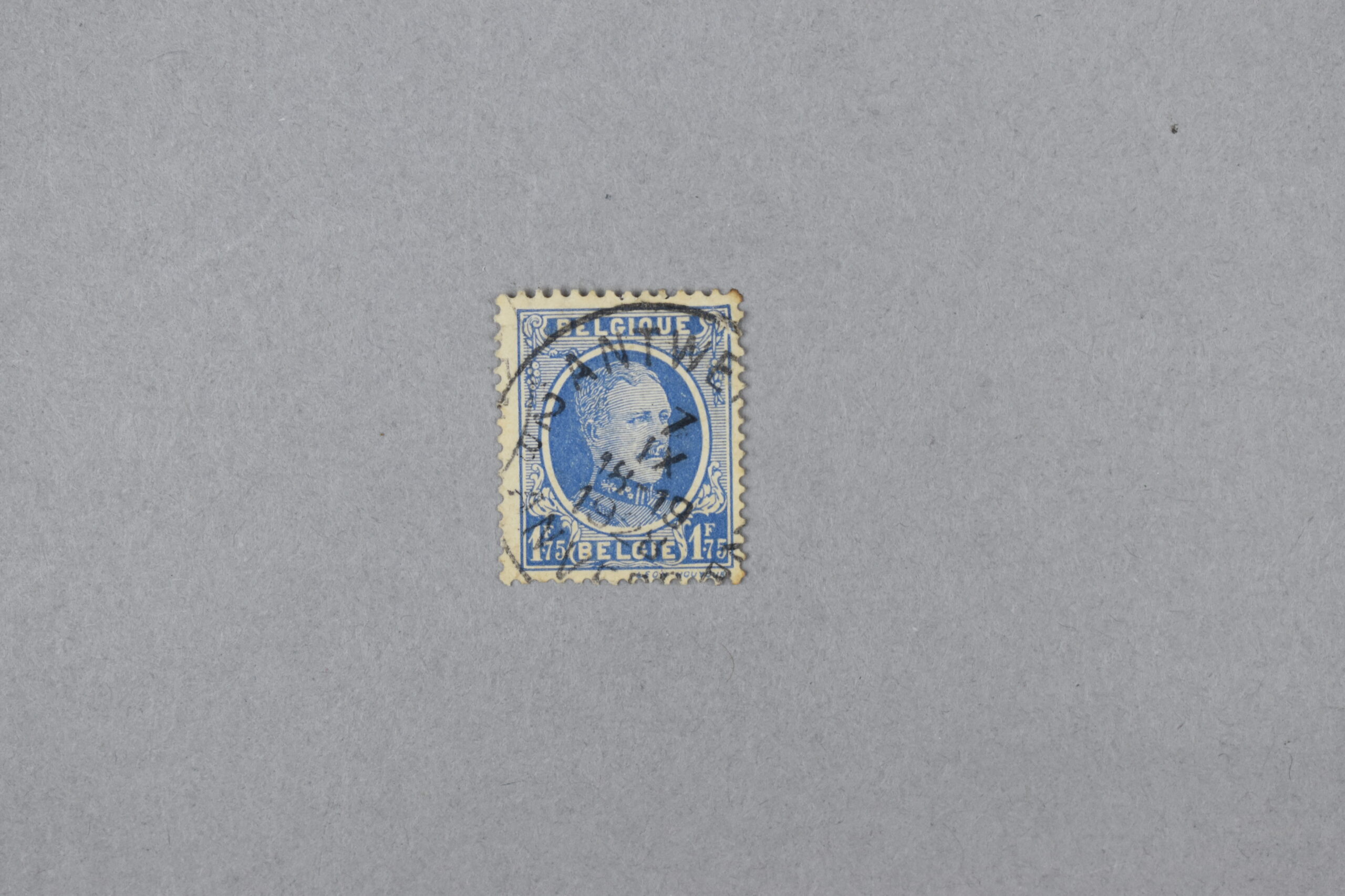 Retrato de Alberto 1 de Bélgica en un fondo ovalado que se encuentra sobre un fondo adornado con las palabras BELGIQUE en lo superior y BELGIE en lo inferior, con el numero 1.75 en una esquina y la F en la otra. Todo en color azul.