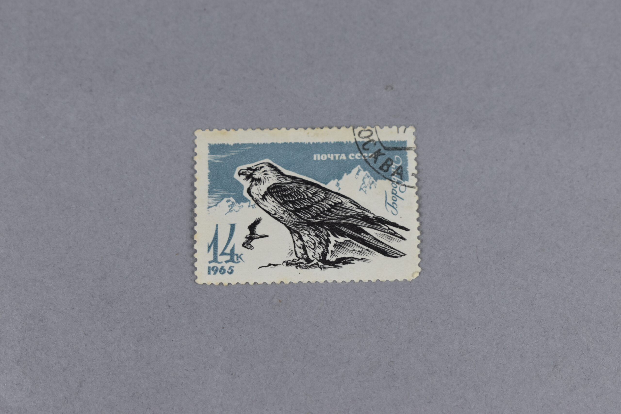 Estampilla color blanco en cuyo centro se encuentra una ilustración de un ave sobre la nieve, presumiblemente un águila de cola blanca. Se presentan dos ilustraciones, una sentada sobre la y otra volando con las alas extendidas, además se puede apreciar de fondo una cadena montañosa. El ejemplar fue emitido en el año 1965.