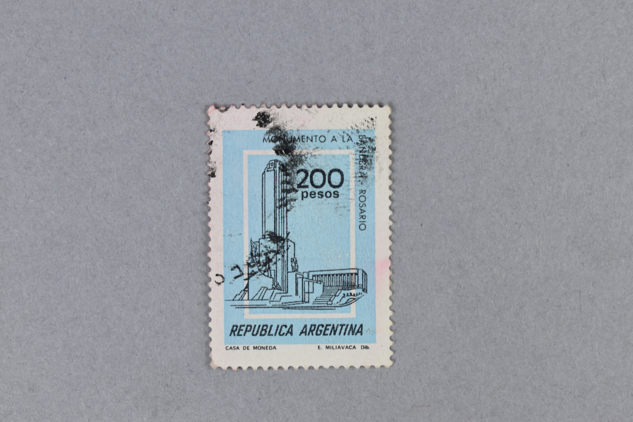 Estampilla color blanco que posee un rectángulo color celeste en cuyo centro se encuentra una ilustración referente al Monumento a la Bandera, situado en la ciudad de Rosario, Santa Fe, inaugurado en el año 1957 en conmemoración del primer izamiento de la bandera argentina en 1812 por Manuel Belgrano. Se puede observar el valor facial cerca a la parte más alta del monumento.