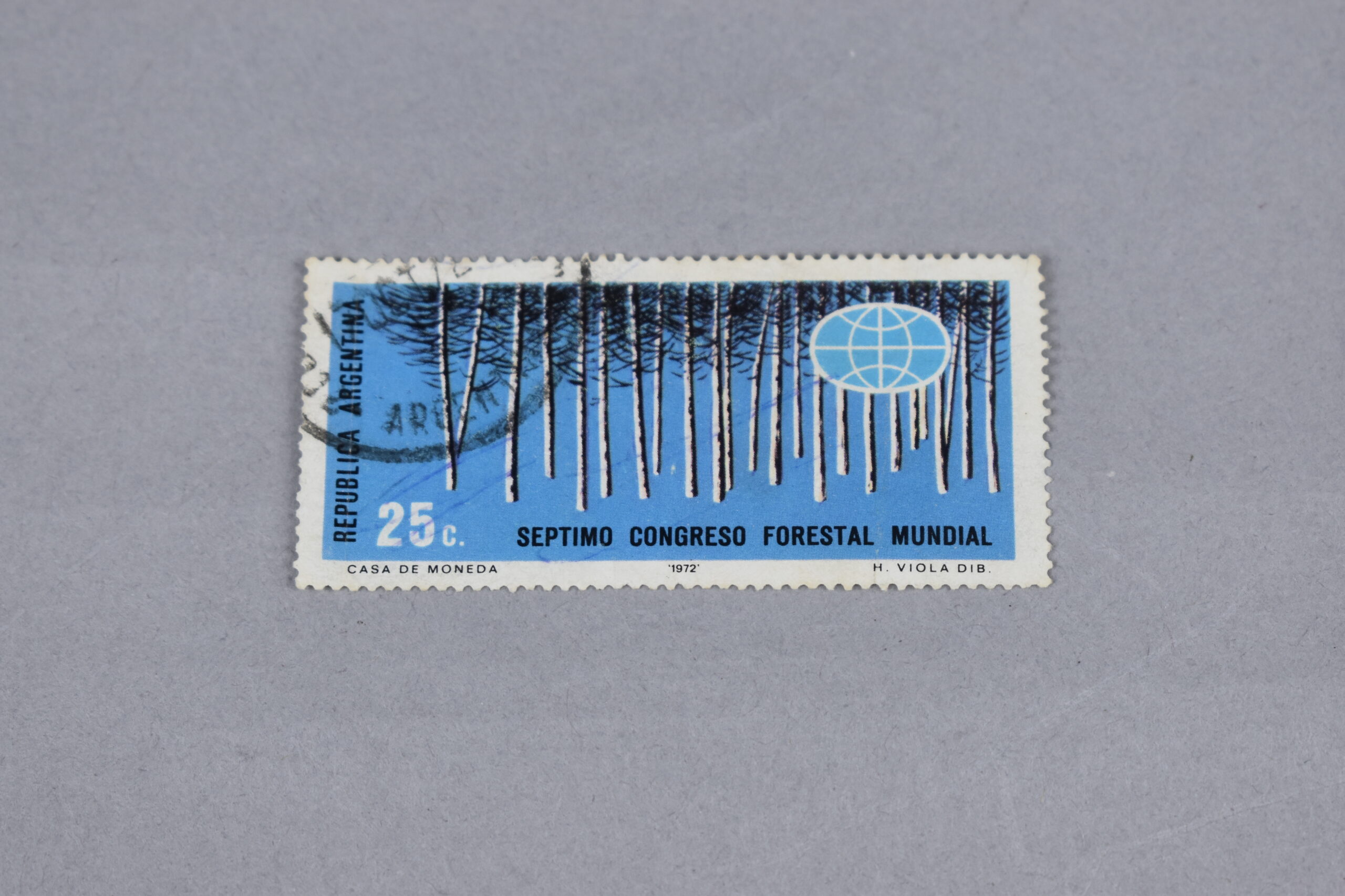 Estampilla color blanco en cuyo interior se encuentra una ilustración de un bosque de árboles con troncos blancos y ramas negras que están sobre un fondo celeste. Esta estampilla fue hecha en conmemoración del Séptimo Congreso Forestal Mundial, el cual se celebró del 6 al 14 de octubre de 1972 en la Ciudad de Buenos Aires, siendo el primero de su tipo en celebrarse en Latinoamérica. El ejemplar fue hecho en el mismo año de la celebración del encuentro.