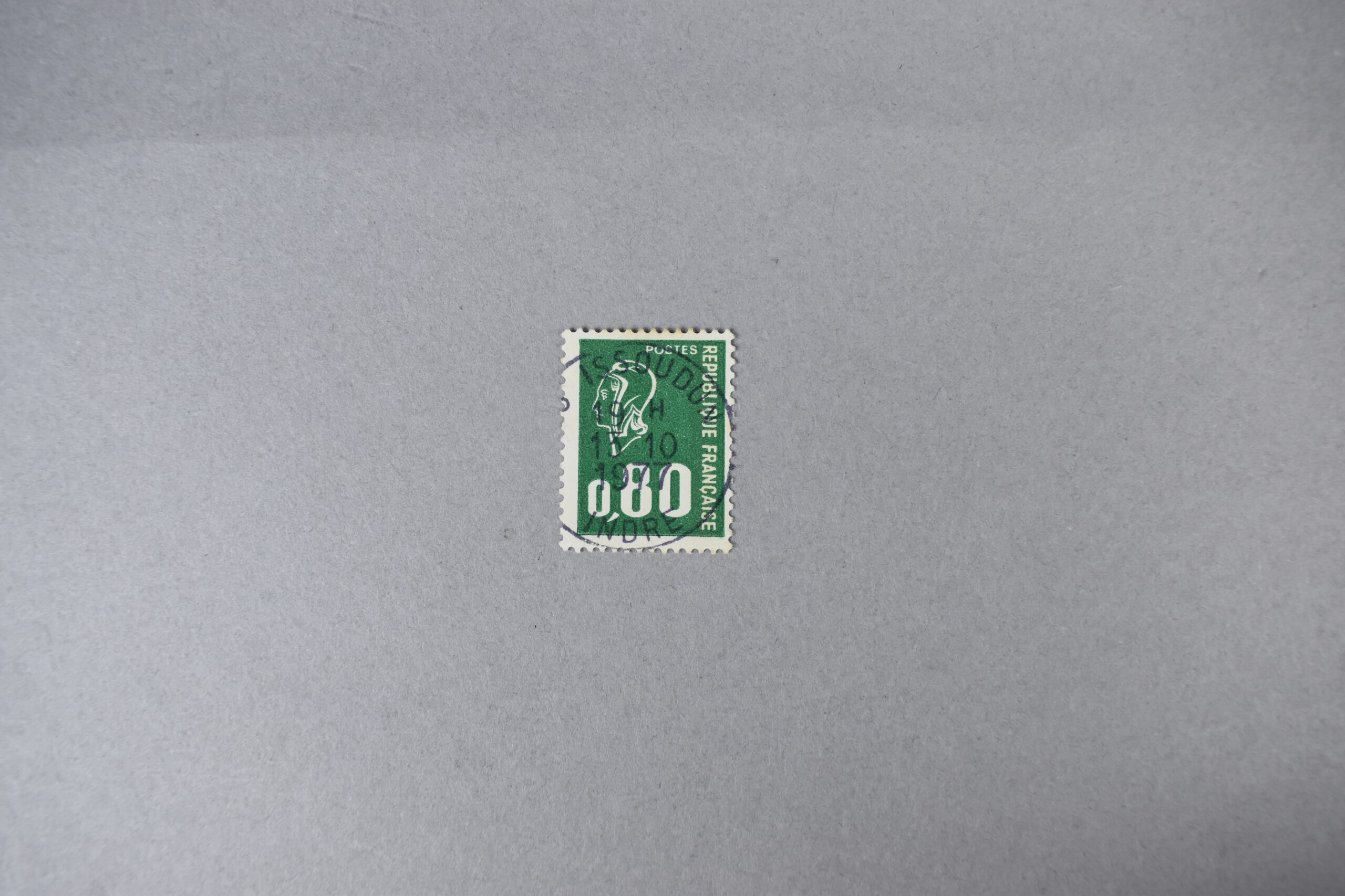 Estampilla que presenta en su interior una ilustración de líneas blancas, sobre fondo verde esmeralda, de perfil referente a la personificación de la nación y república francesa: Marianne, la cual porta un gorro frigio simbolizando la libertad.