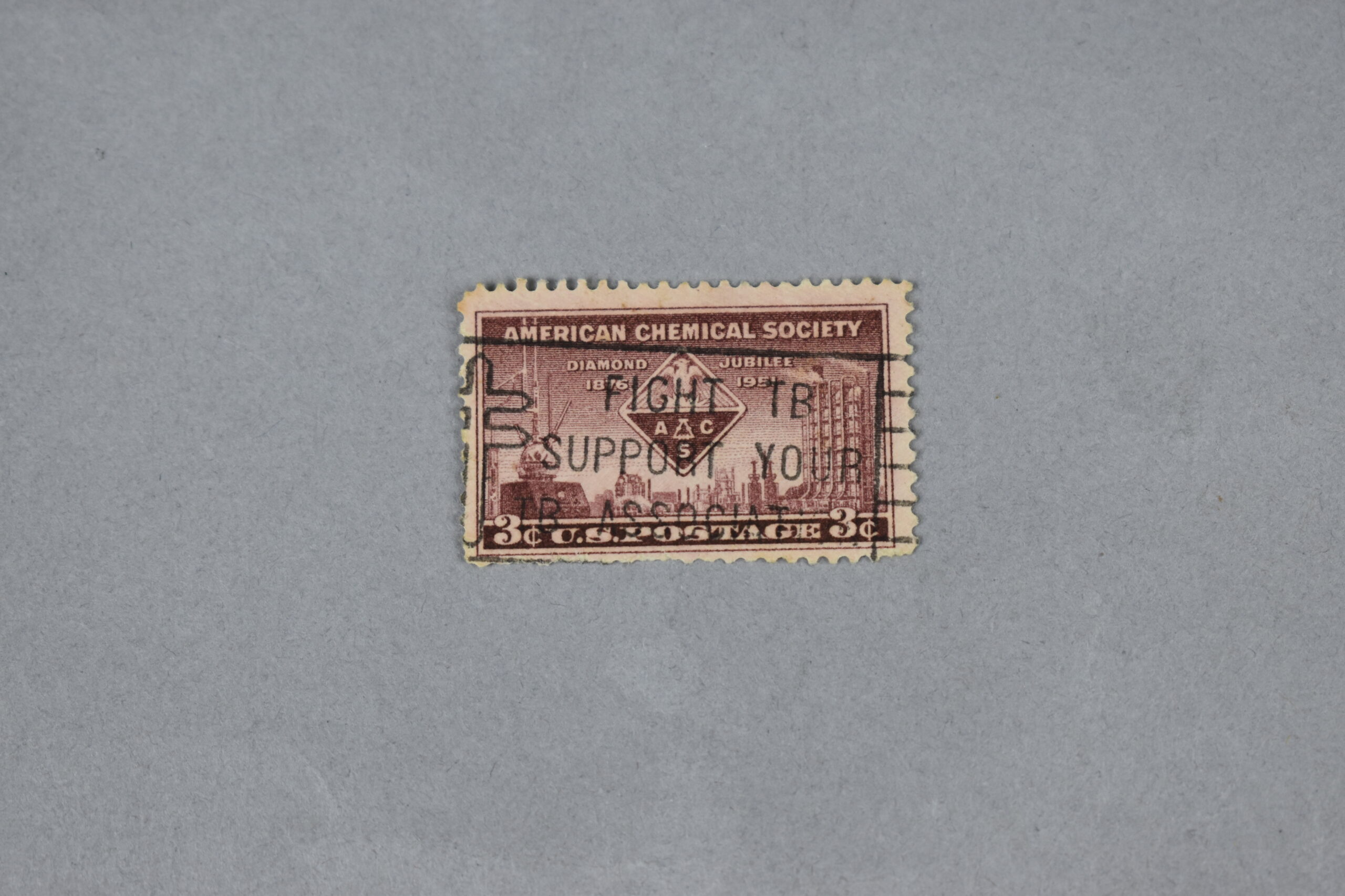 Estampilla en cuyo centro se encuentra una serie de ilustraciones en color marrón referentes a artilugios y máquinas relacionadas con la química y en el centro se aprecia el logo de la American Chemical Society (Sociedad Estadounidense de Química). Este ejemplar conmemora y celebra el jubileo de diamante de la asociación (60 años de su fundación: 1876-1951) además de que fuese emitido el mismo año de la conmemoración, 1951.