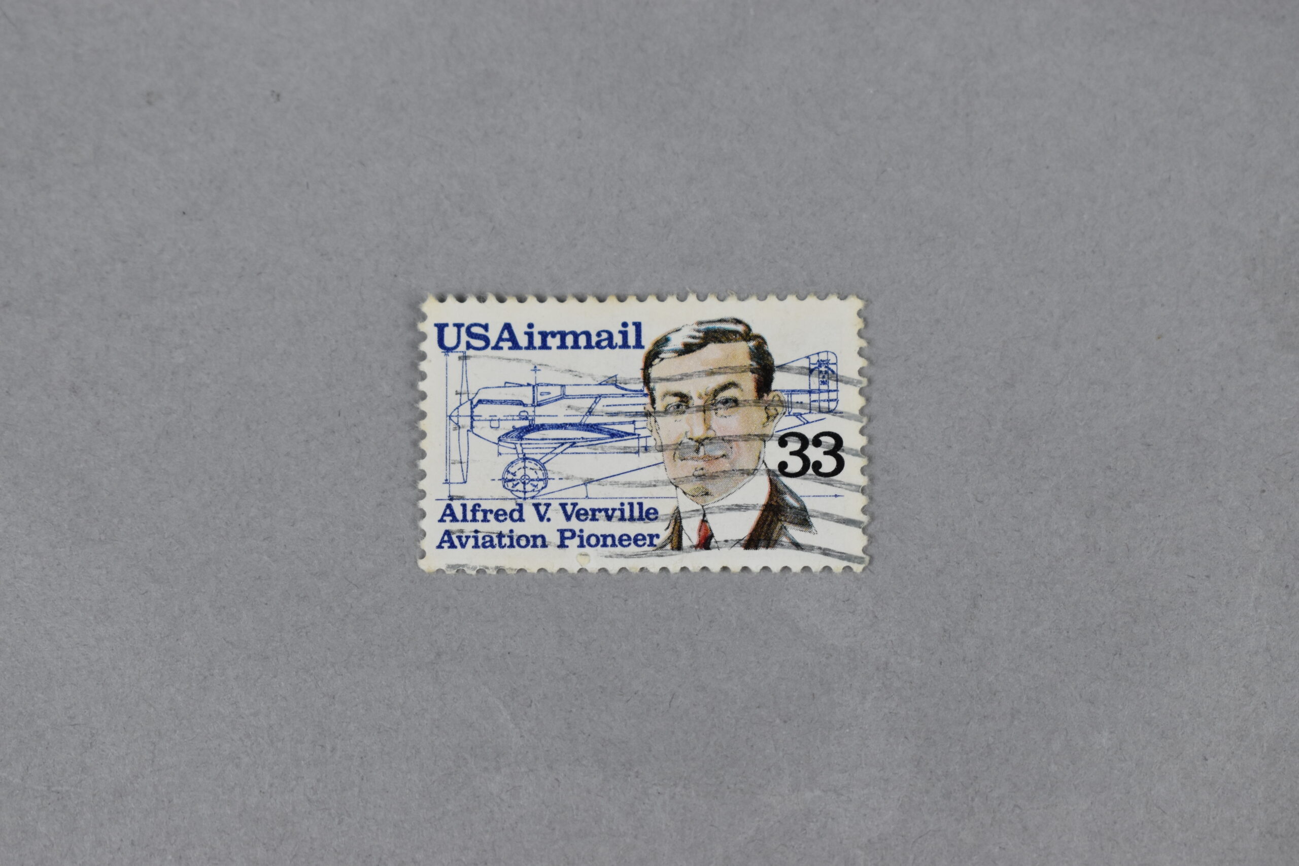 Estampilla en cuyo lado izquierdo se encuentra un retrato del pionero de la aviación y motociclismo estadounidense: «Glenn Curtiss» (1878-1930), siendo uno de los más importantes en el rubro de la aviación y en el diseño como producción de motores. A su costado se encuentra una de sus creaciones, el Curtiss No.1 o «Golden Bug», siendo el primer diseño independiente de este.
