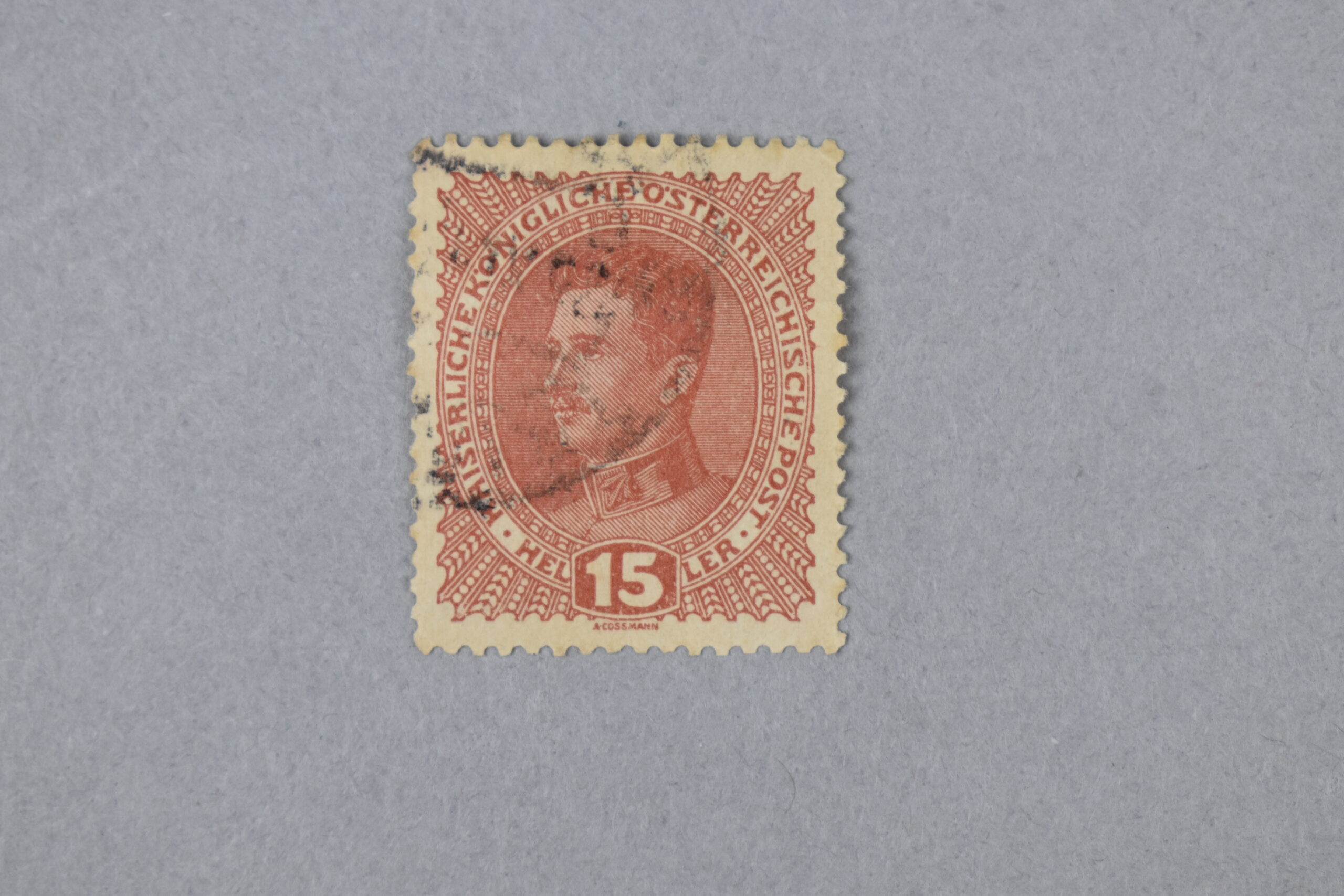 Estampilla en cuyo centro se encuentra un retrato en color rojo del último emperador de Austria y rey de Hungría y beato: «Carlos I de Austria y IV de Hungría», perteneciente a la casa de Habsburgo-Lorena (1887-1922, reinado: 1916-1918). El ejemplar podría haber sido hecho en el tiempo de su reinado o antes de ser coronado.