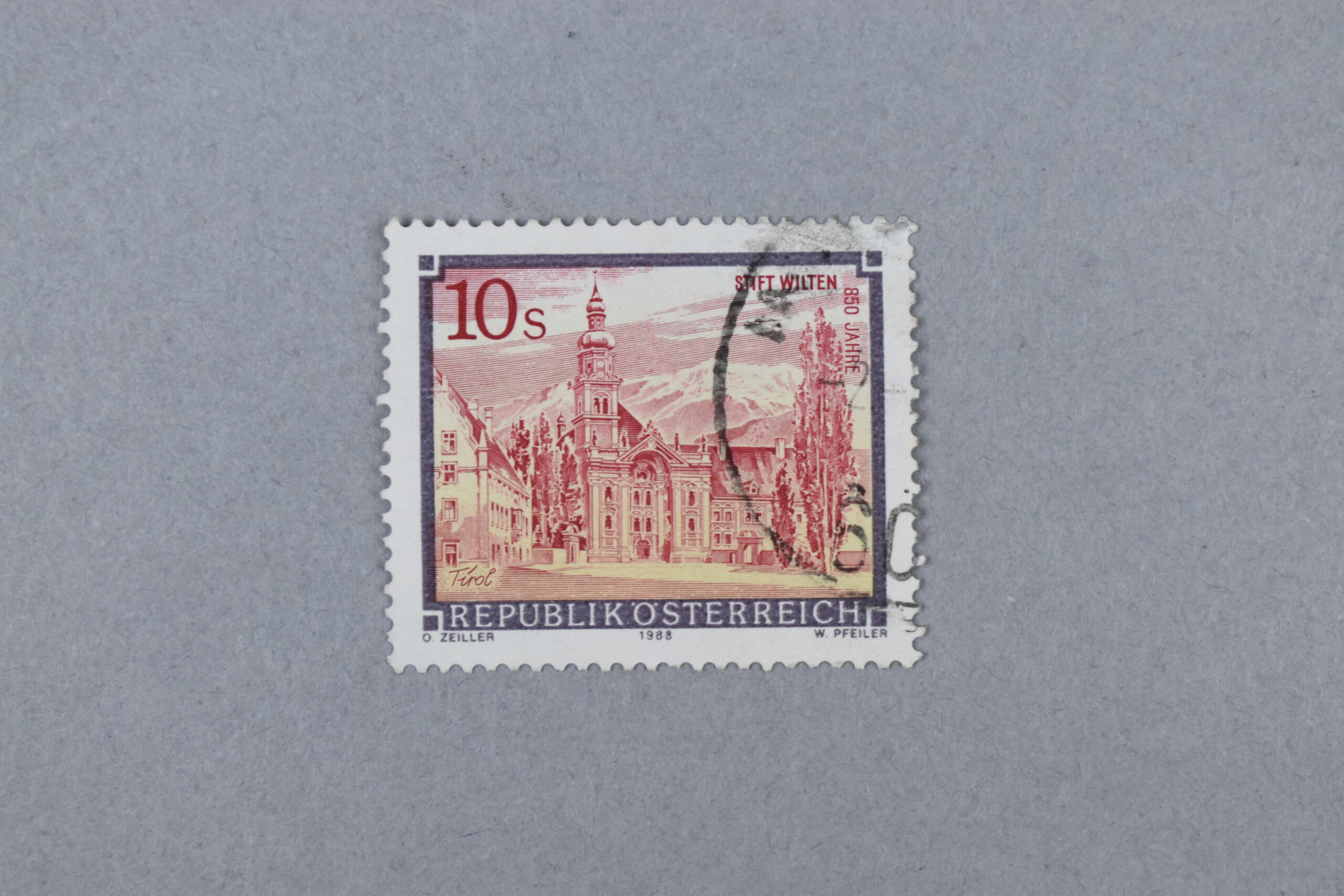 Estampilla en cuyo centro se encuentra una ilustración referente a la Abadía de Wilten (alemán: Stift Wilten), ubicada en la ciudad homónima, en el estado de Tirol. Fue fundada en el año 1138 pero su edificio actual data de los siglos XVII al XVIII y está habitada por los canónigos premonstratenses. El ejemplar conmemora sus 850 años y fue emitido en el año 1988.