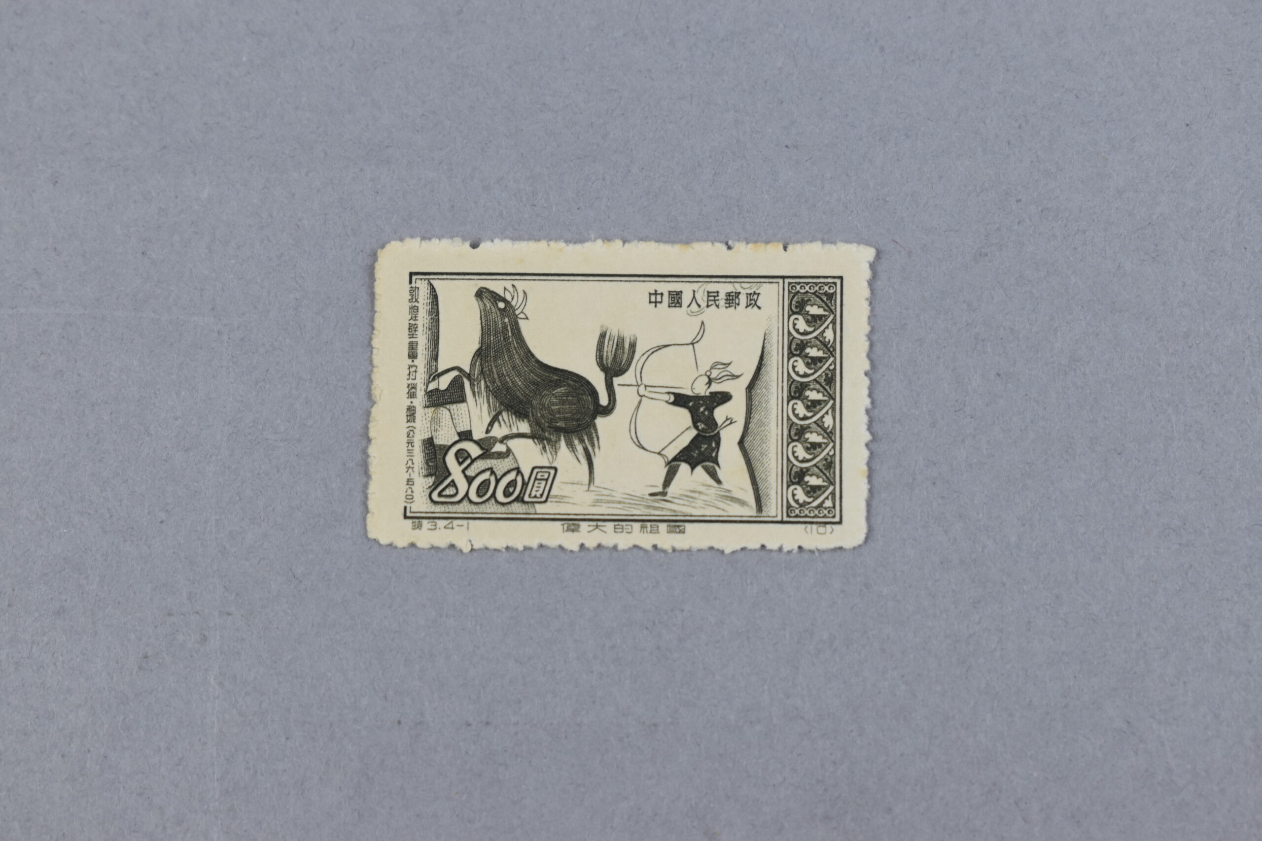Estampilla rectangular con la imagen de un cazador con arco y un animal bicornio de pelaje lacio.
