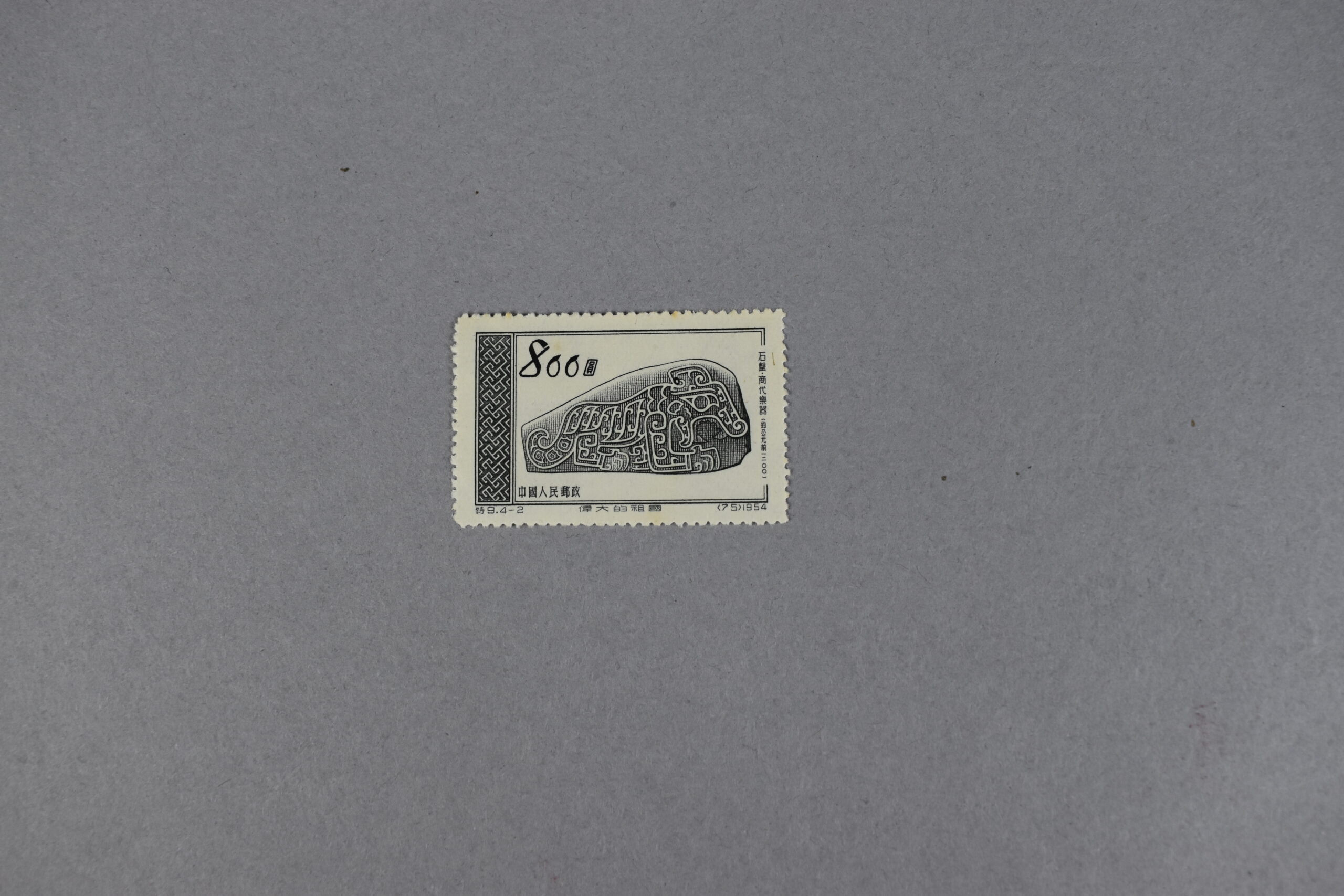 Estampilla rectangular que presenta en su interior una piedra tallada con el dibujo de un animal mitológico perteneciente a la Dinastía Shang (1600-1046 a.C) El ejemplar fue emitido en el año 1954.