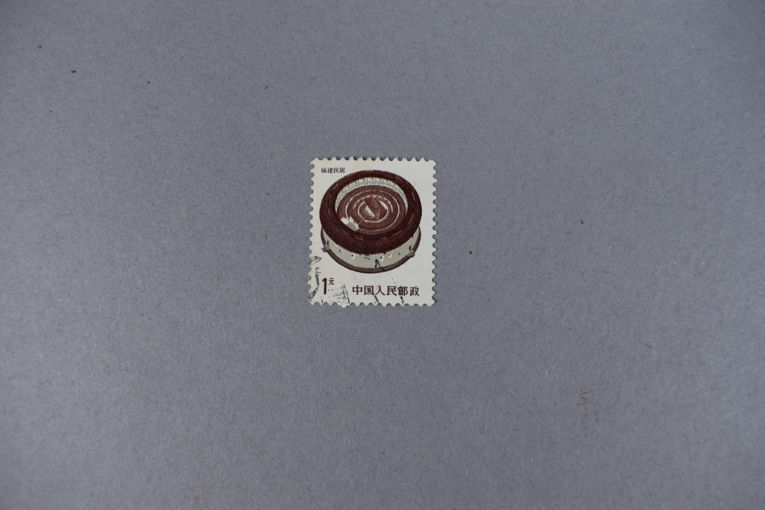 Estampilla rectangular que presenta en su interior una ilustración referente a un Tulou, una edificación tapial de la etnia Hakka la cual consta de un recinto de viviendas amurallado, puede albergar 80 familias y algunos poseen agujeros para cañones o armas de fuego. Fueron construidos principalmente entre los siglos XII al XX, sobre todo para la defensa contra bandidos.