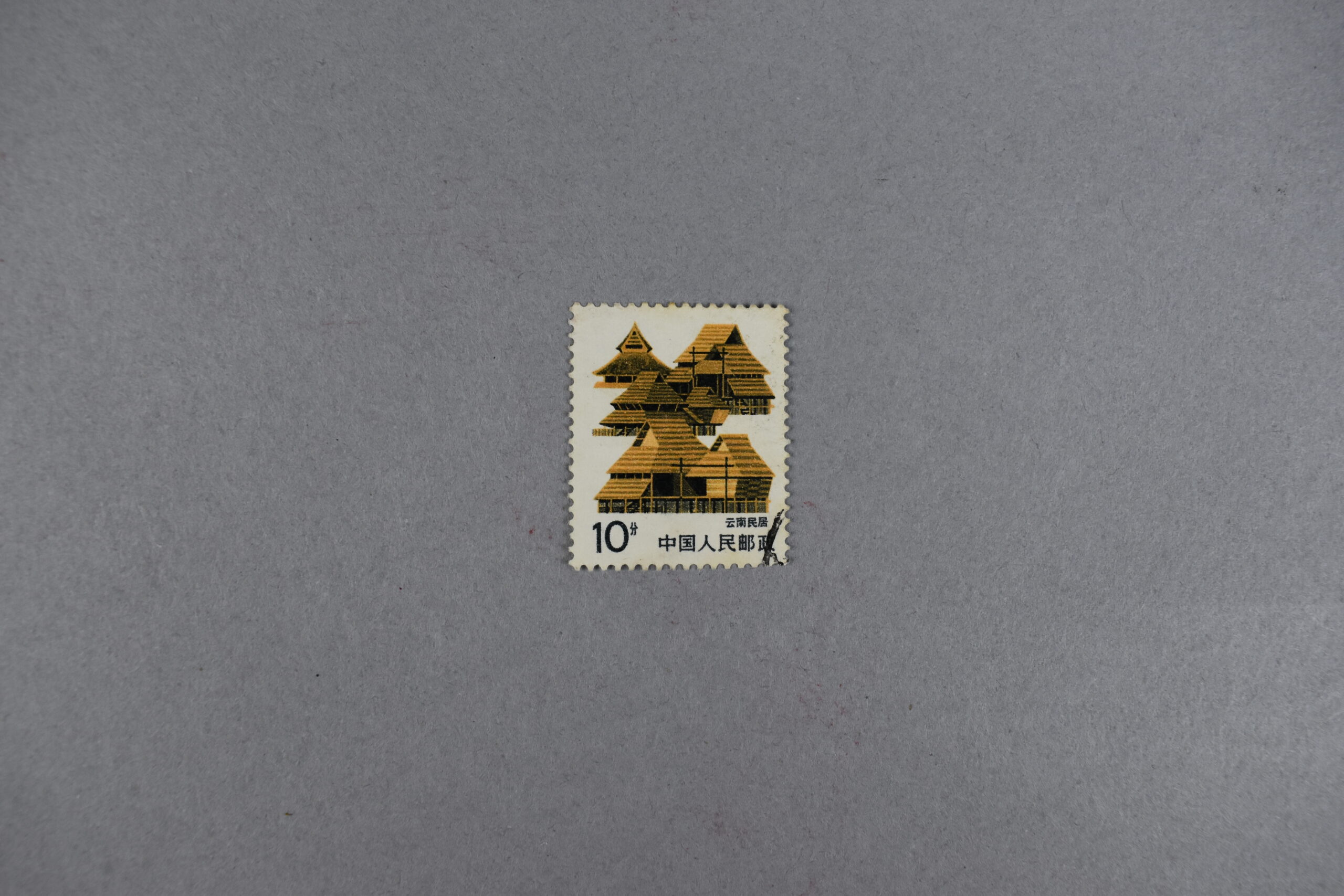 Estampilla rectangular que presenta en su interior una ilustración referente a las casas de bambú hechas por la etnia Dai, quienes habitan en la provincia de Yunnan. Sus casas están hechas, como se ve en la imagen, con materiales sencillos pero resistentes a la lluvia e inclemencias del clima.
