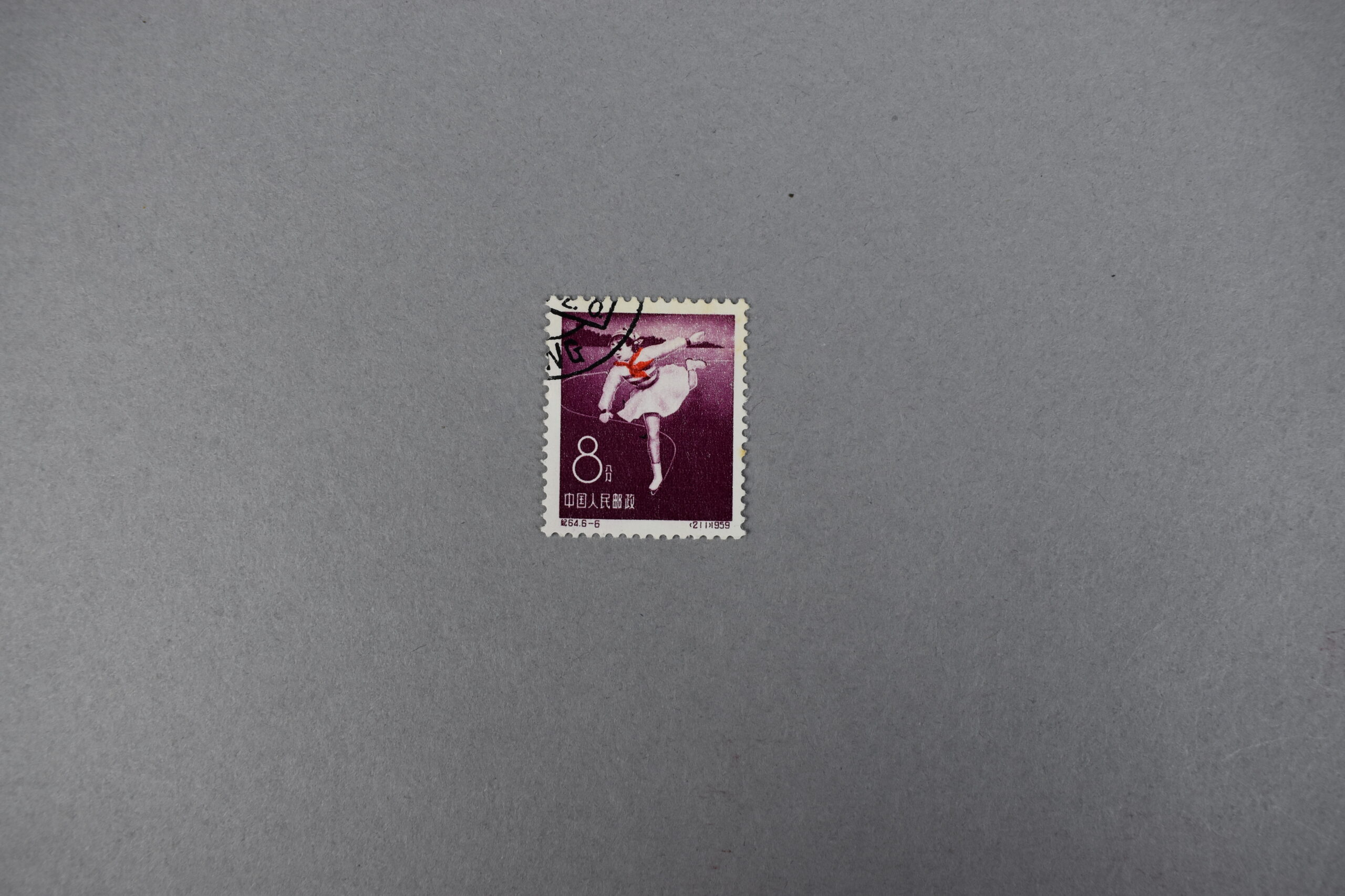 Estampilla que presenta en su interior una ilustración de color morado que presenta a una miembro femenino de los Jóvenes Pioneros de China en este caso realizando patinaje sobre hielo. El ejemplar fue emitido en el año 1959.