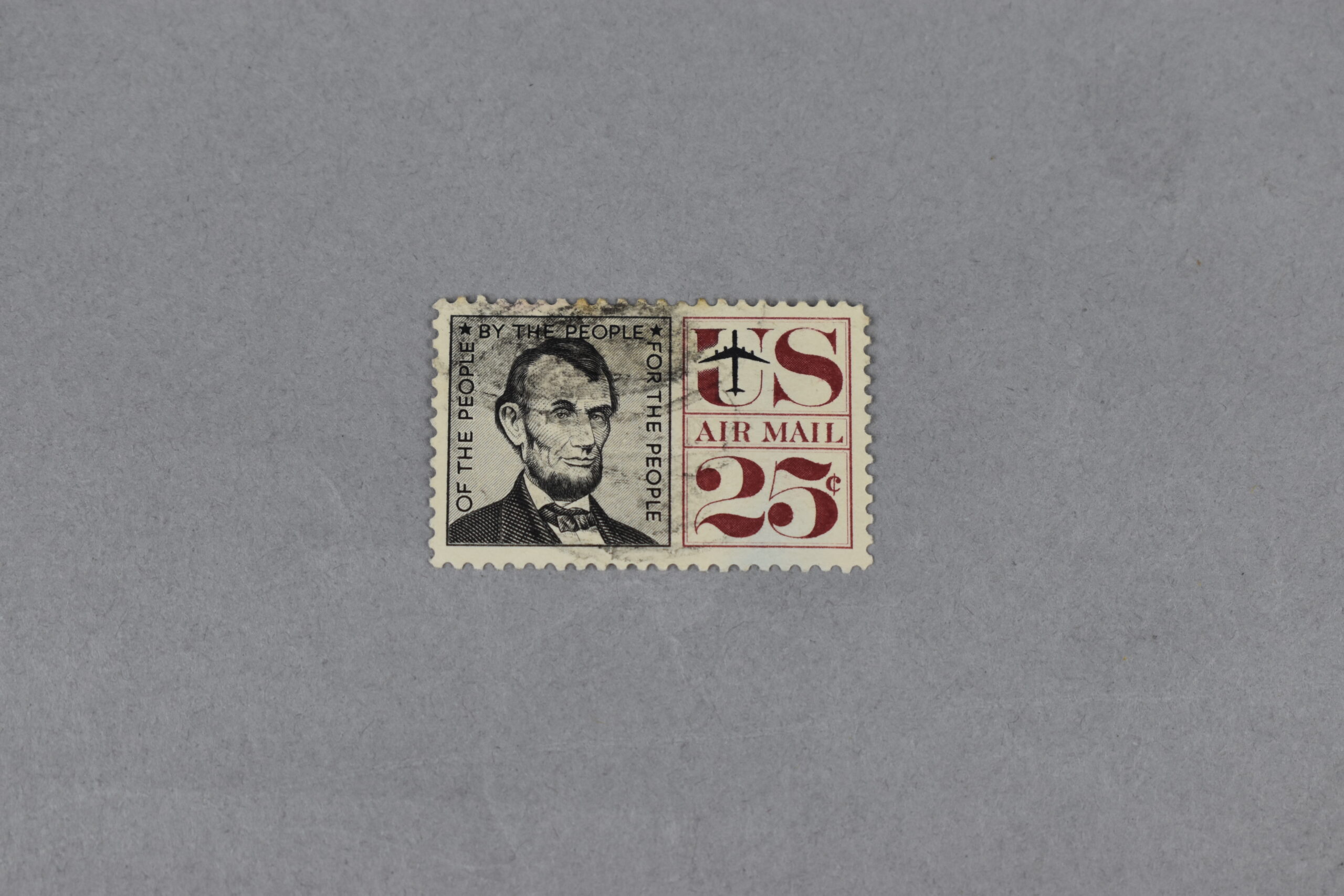 Estampilla rectangular que presenta dos sellos: uno con la imagen de Abraham Lincoln y otro con el emblema del servicio postal y su valor.