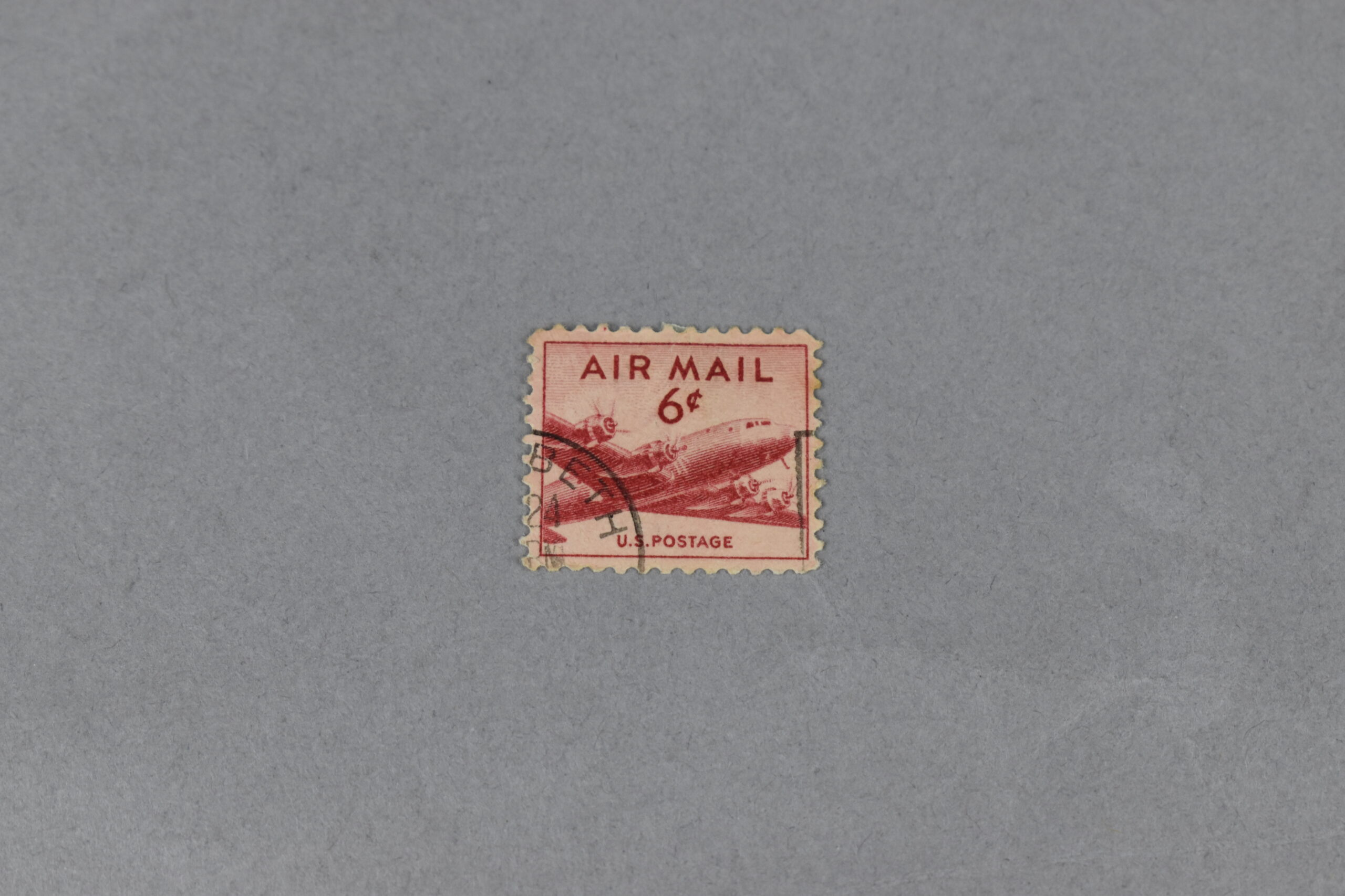 Estampilla de color rojo con el diseño de un avión en pleno vuelo.