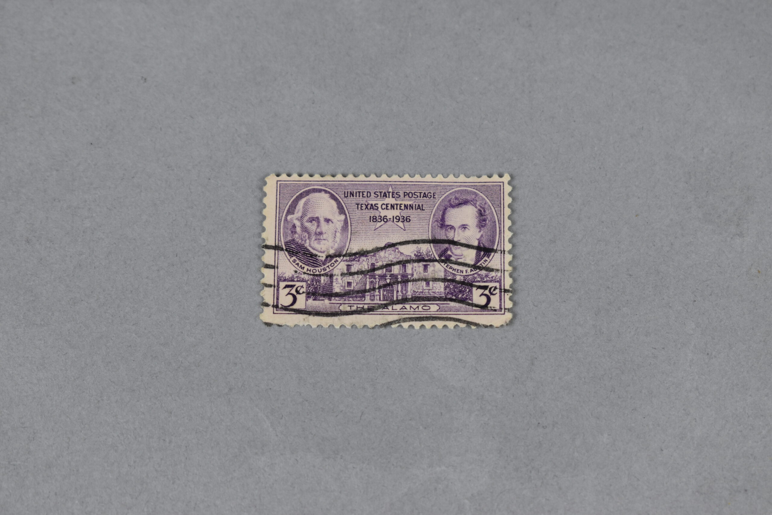Estampilla que presenta los retratos de Sam Houston y Stephen F. Austin, con la imagen de El Álamo.