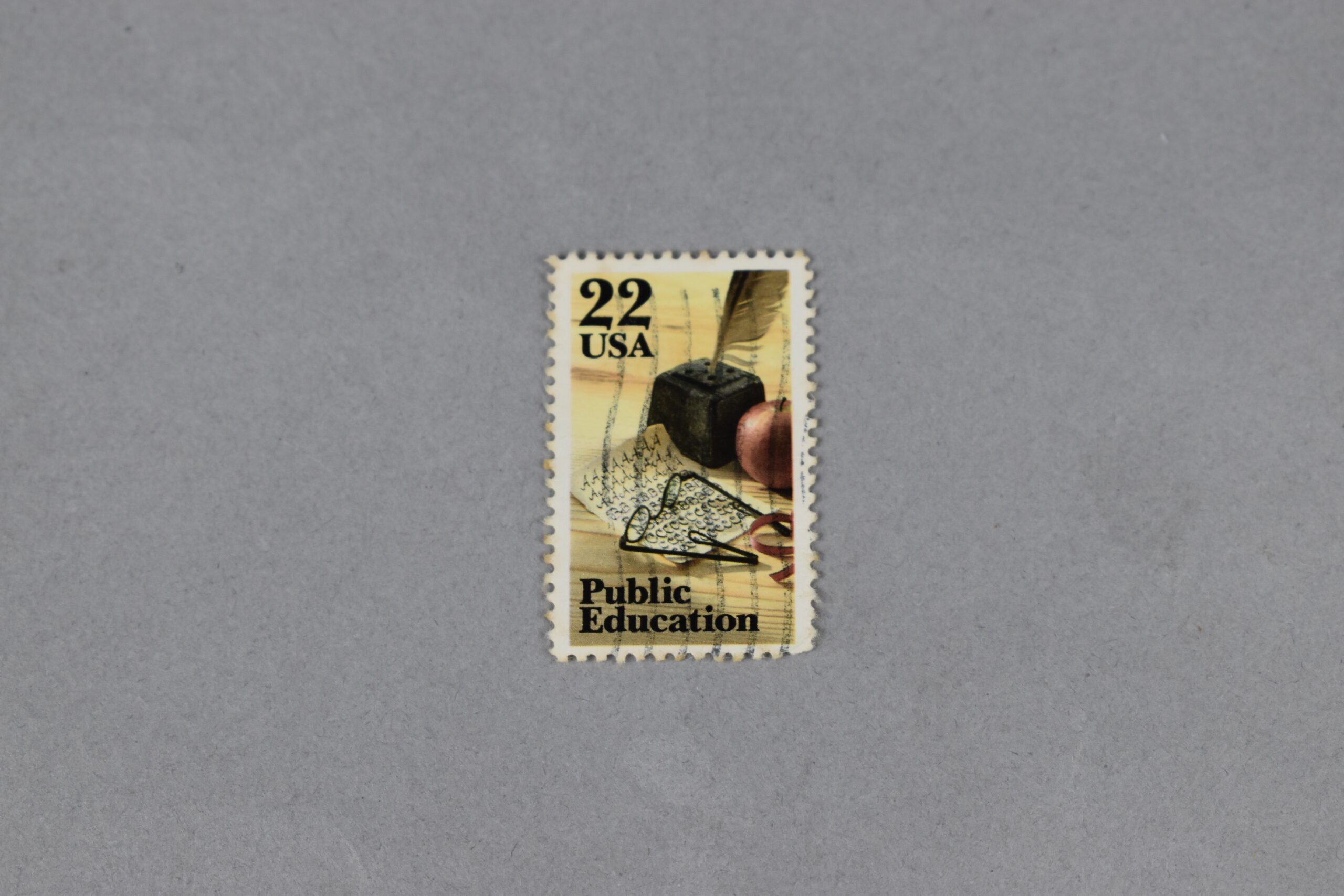 Estampilla que presenta la imagen de un escritorio junto a elementos educativos. Estampilla en conmemoración a educación pública.
