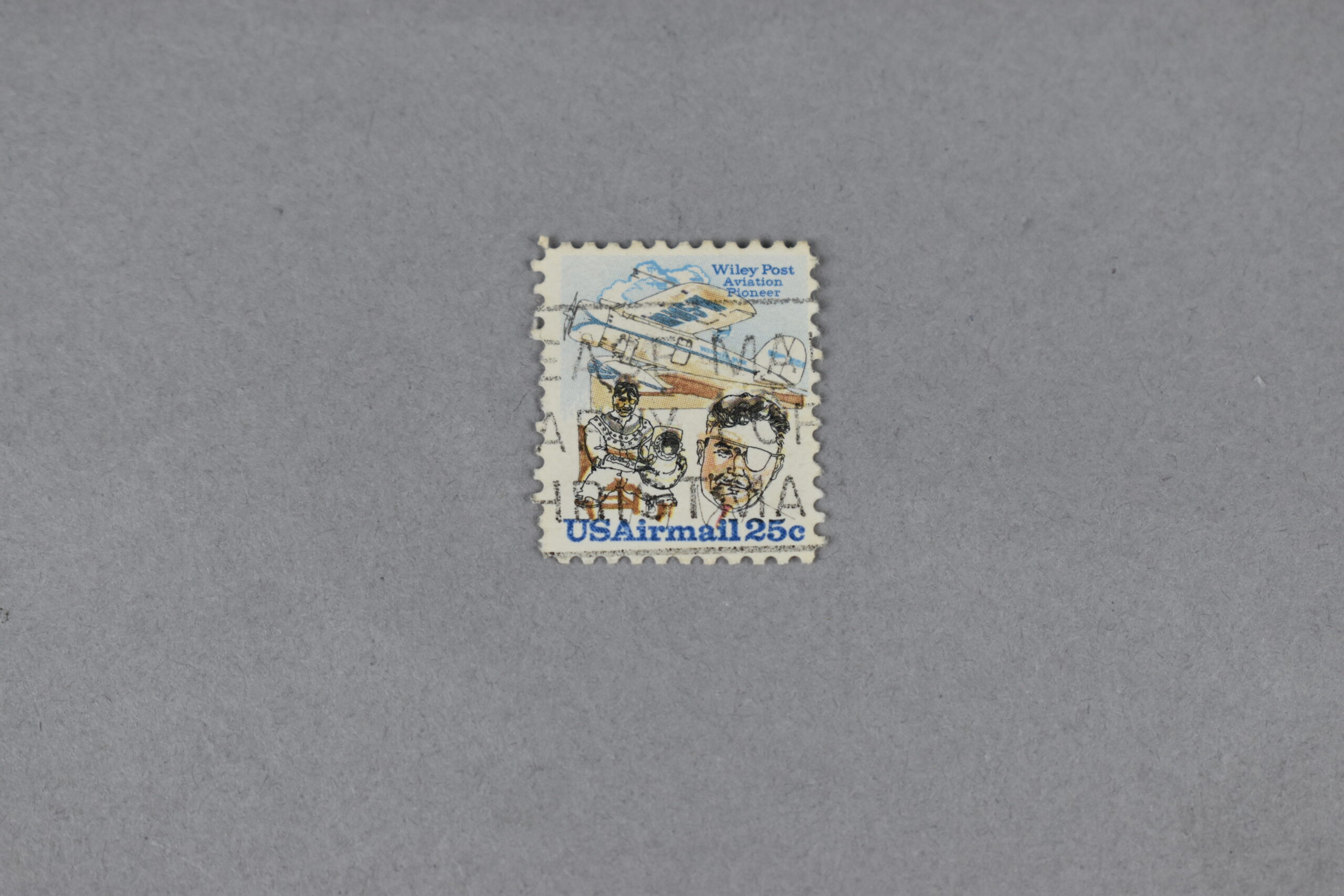 Estampilla con el dibujo de un avioneta en fondo celeste, los rostros de “Wiley Post””, piloto famoso por ser el primero en viajar en avión en solitario.