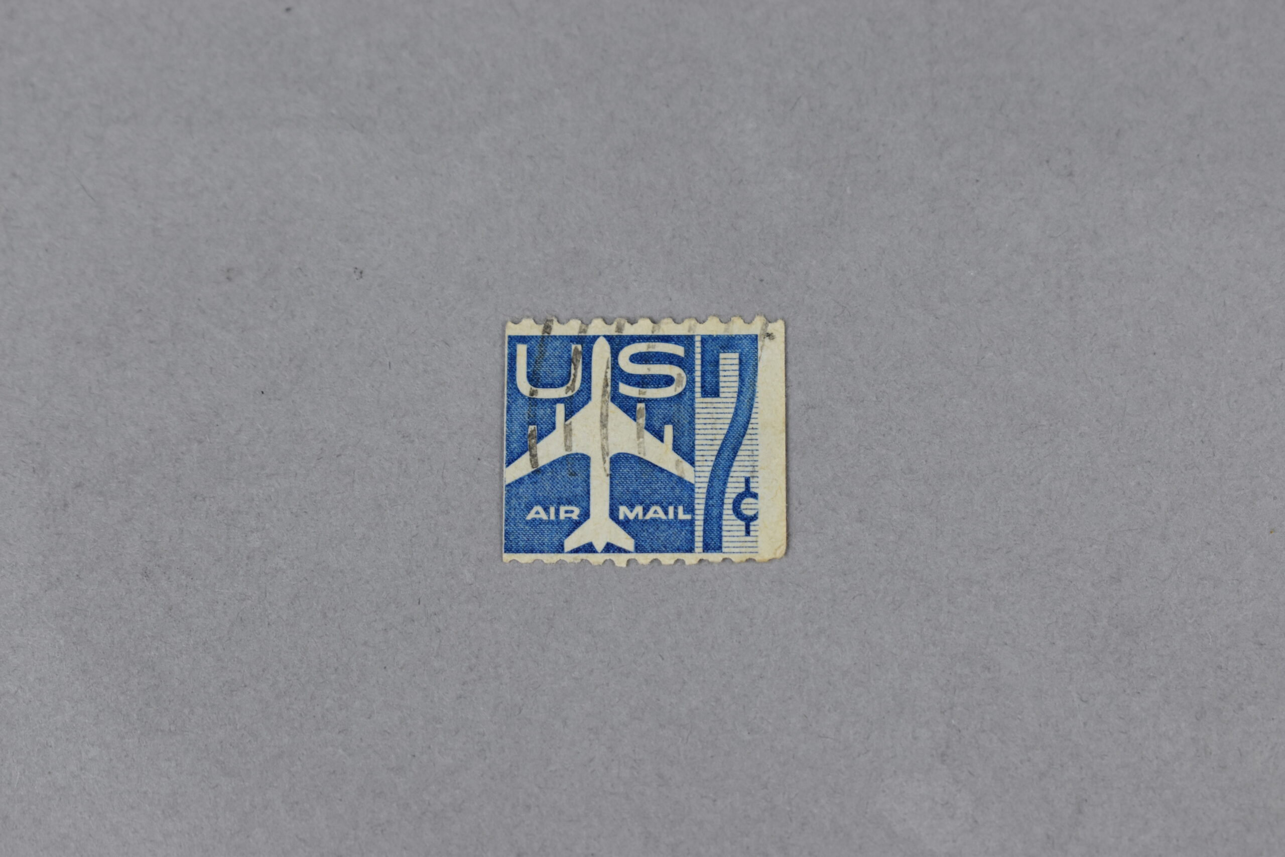 Estampilla con el diseño de un avión representando un sello postal de correo aéreo.