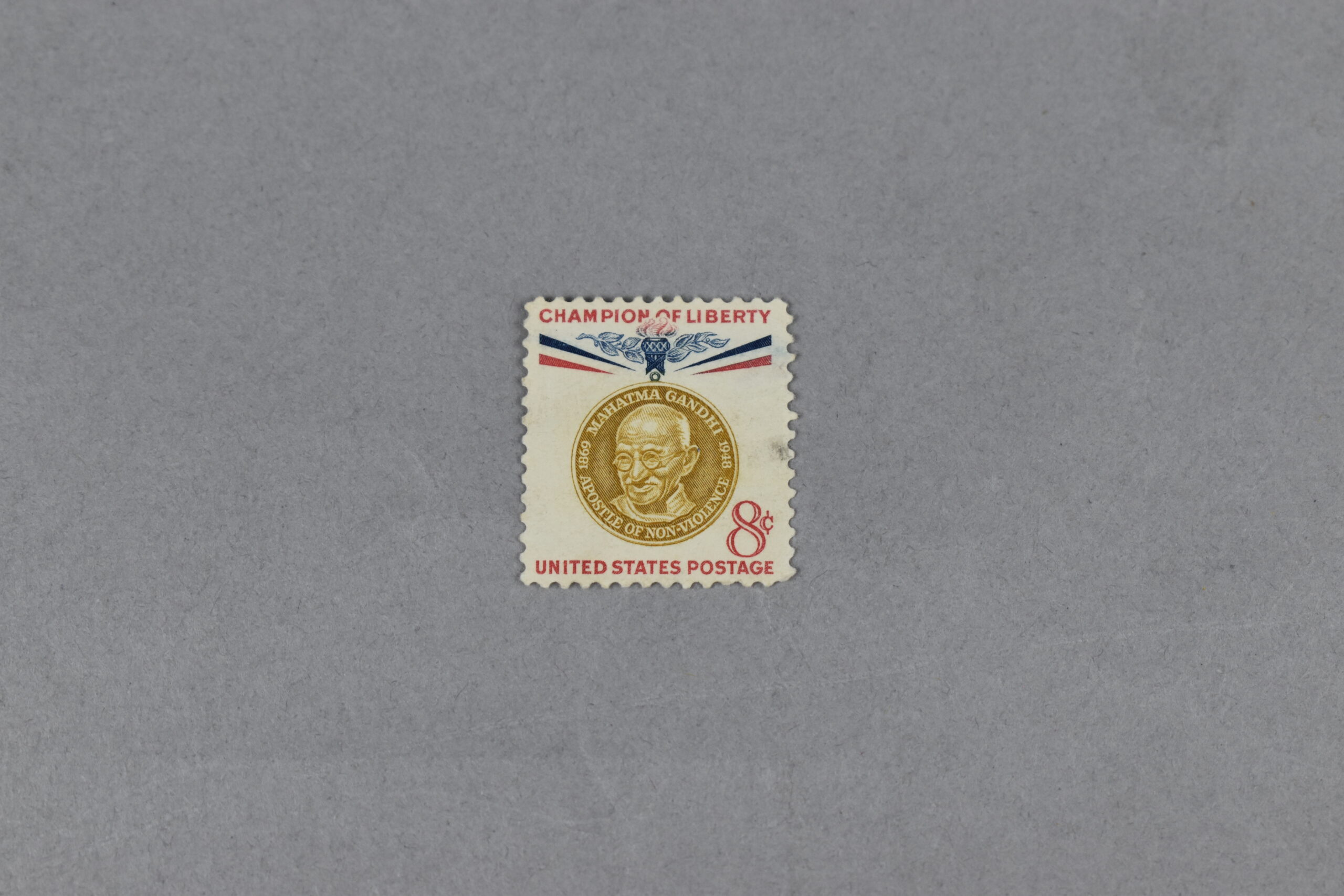 Estampilla de la serie “Champion of Liberty”, con el retrato de perfil frontal del pacifista de la India: “Mahatma Gandhi”.