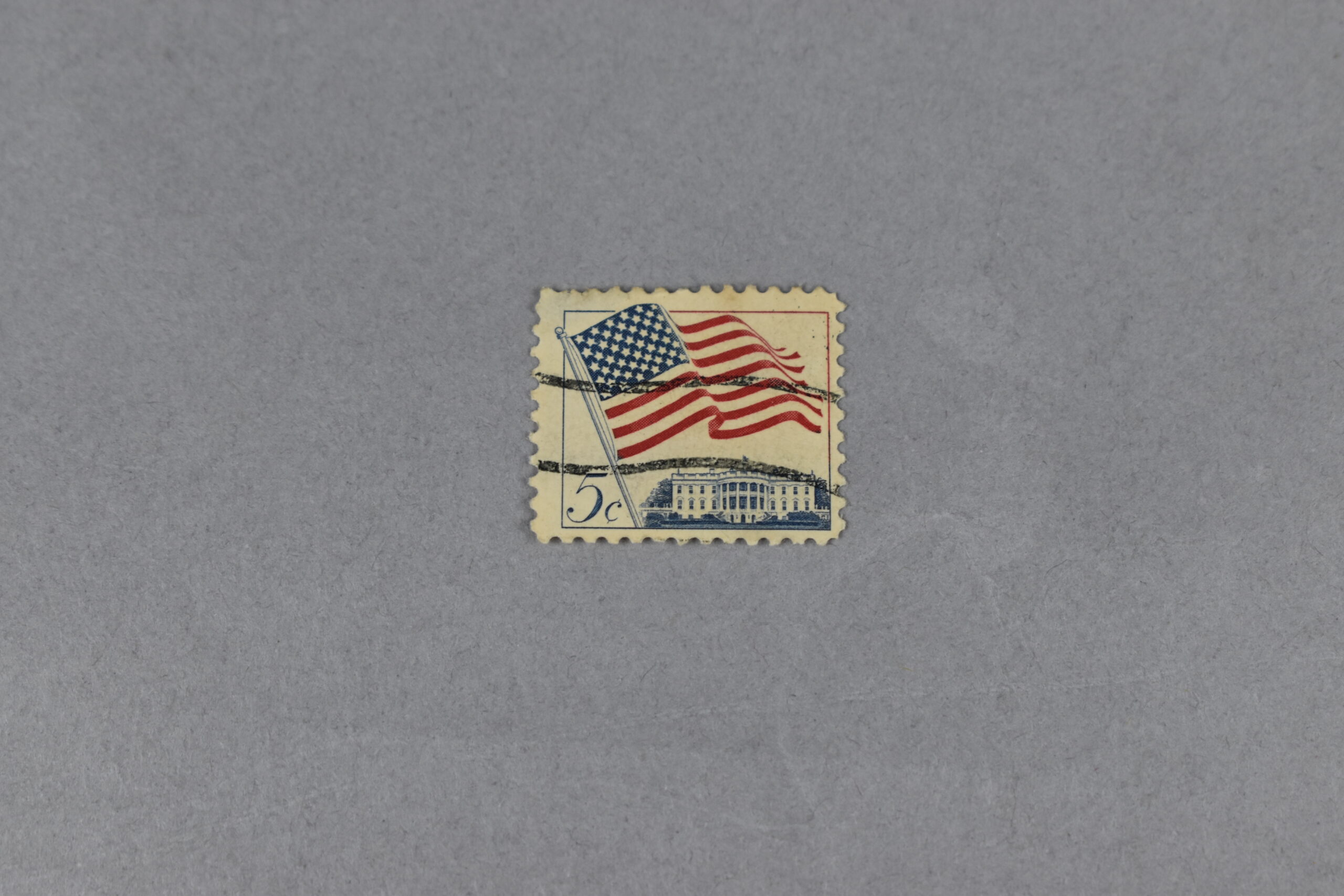 Estampilla con el dibujo de la bandera Estadounidense en primer plano, con la imagen de fondo de la casa blanca.