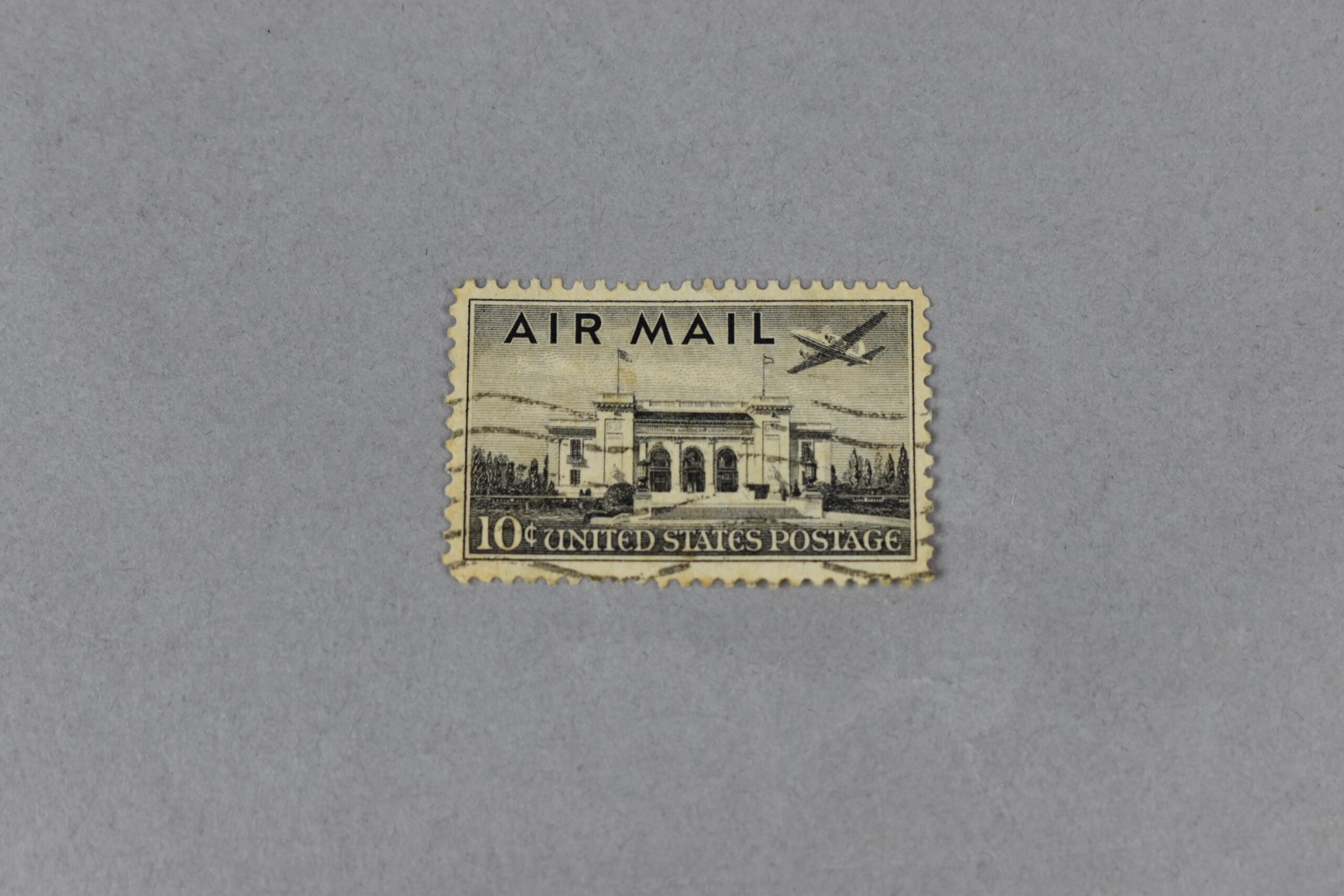 Estampilla donde se ve el diseño de un avión sobrevolando un edificio.
