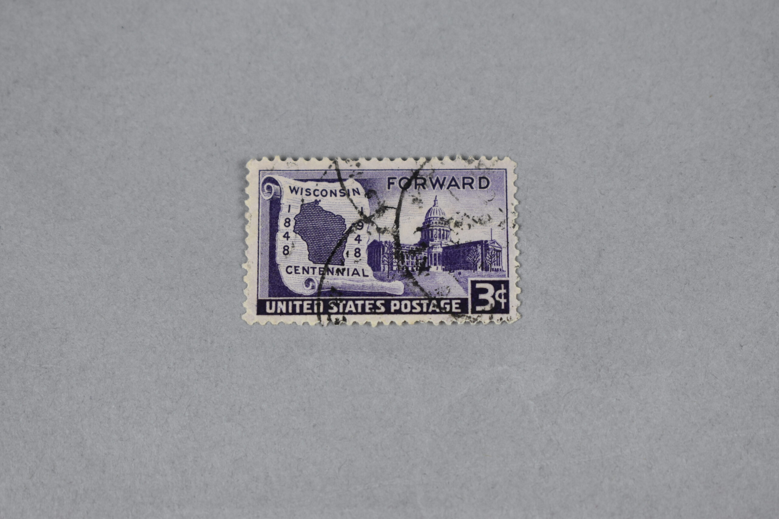 Estampilla conmemorativa al centenario de la fundación del Estado de Wisconsin. Presenta el diseño de un pergamino con el mapa de dicho estado y a la izquierda el capitolio del Estado.