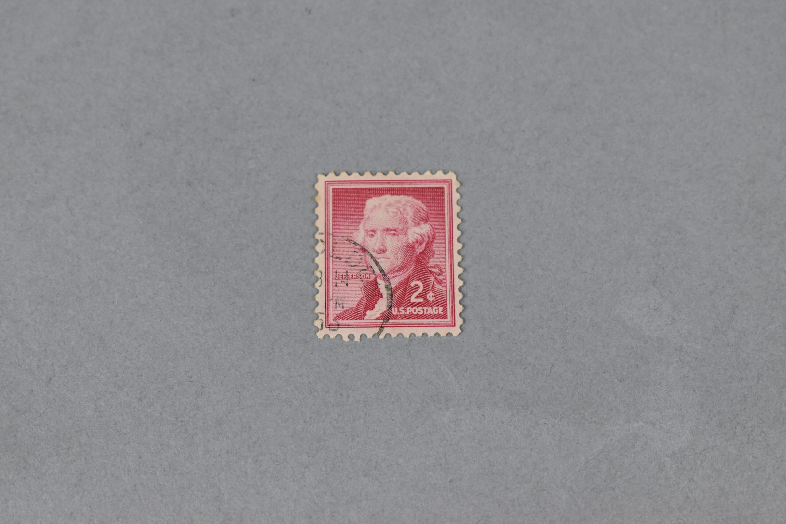 Estampilla con el retrato de perfil derecho del tercer presidente de los Estados Unidos, que gobernó de 1801 hasta 1809: “Thomas Jefferson”.