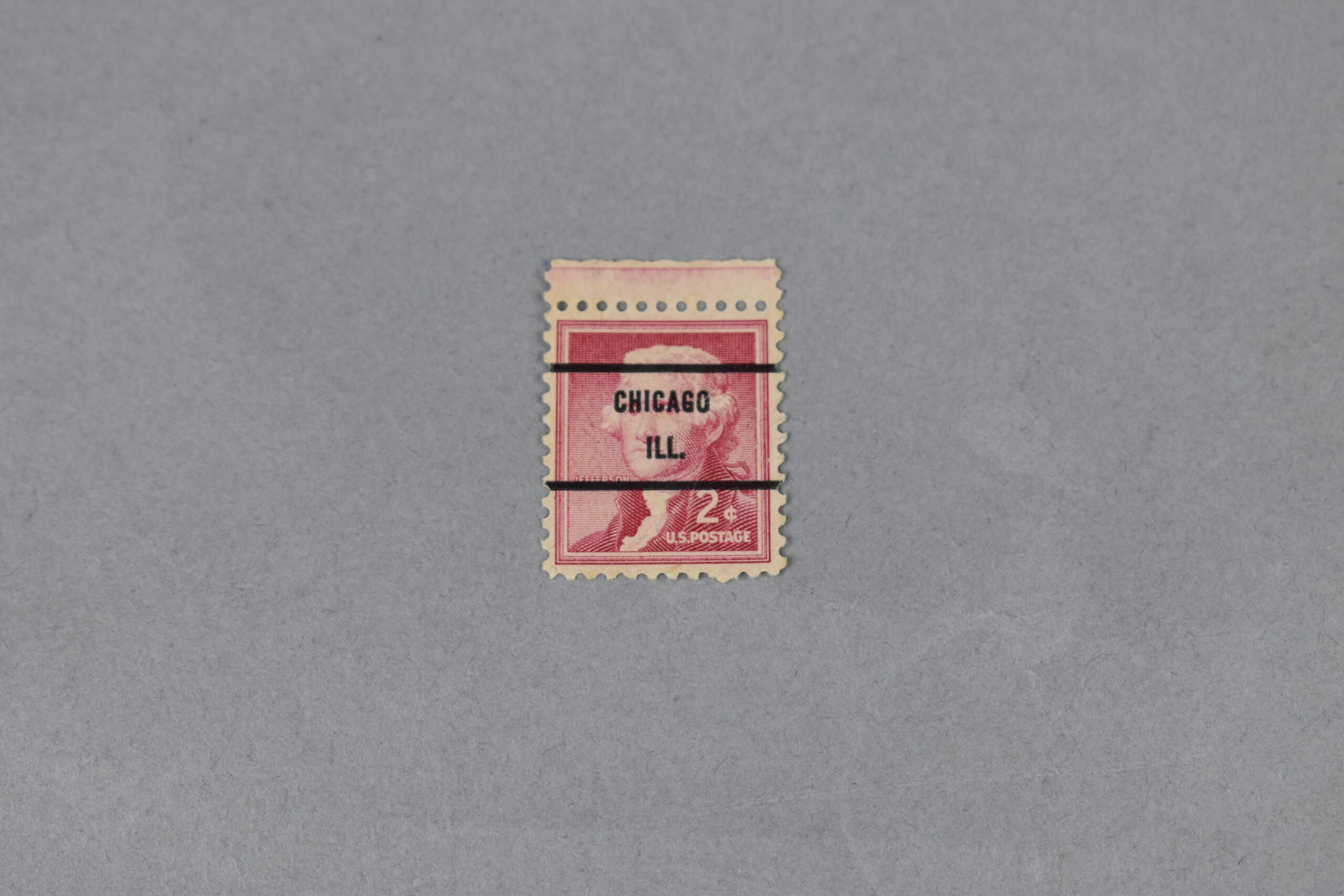 Estampilla con el retrato de perfil derecho del tercer presidente de los Estados Unidos, que gobernó de 1801 hasta 1809: “Thomas Jefferson”.