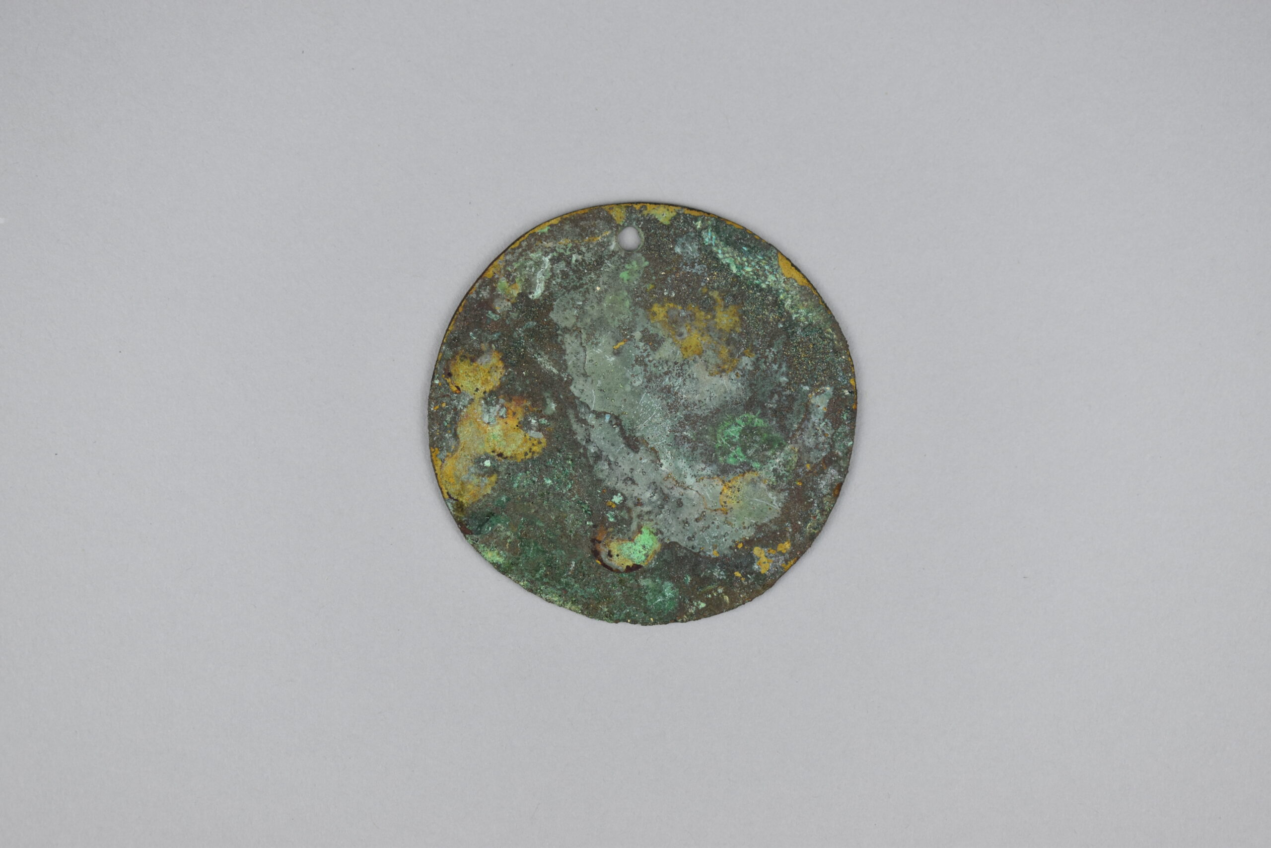 placa circular de 1 cm de grosor, con una perforación circular hacia un extremo. Una de las caras presenta restos de los que sería un textil. Posible aleación con cobre.