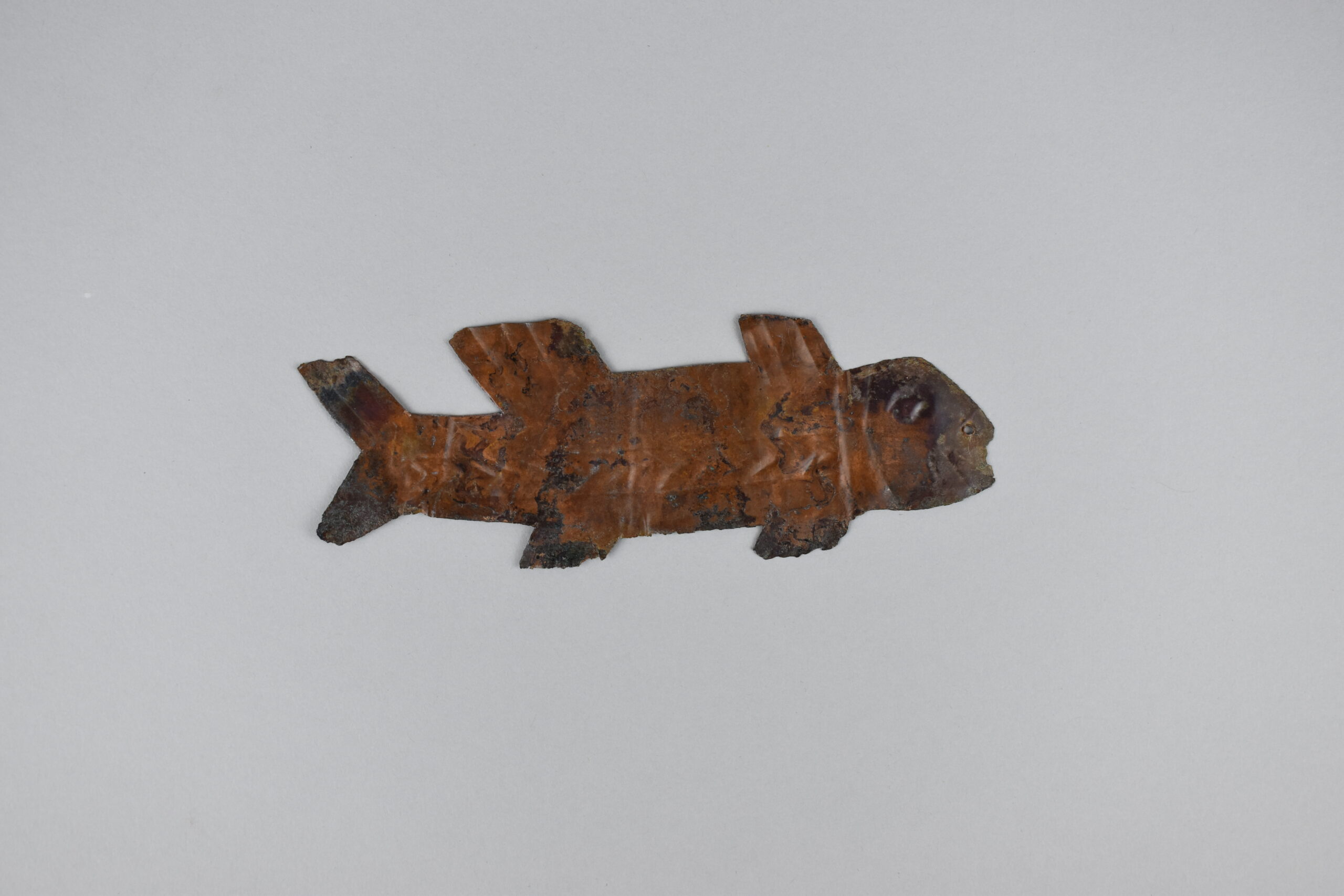 Placa cortada en forma de pez. Presenta ligeras hendiduras que marcan las aletas, la cola y una sección de las escamas; así como la boca y los ojos. Presenta una pequeña perforación en lo que correspondería a la nariz. Probable aleación de cobre.