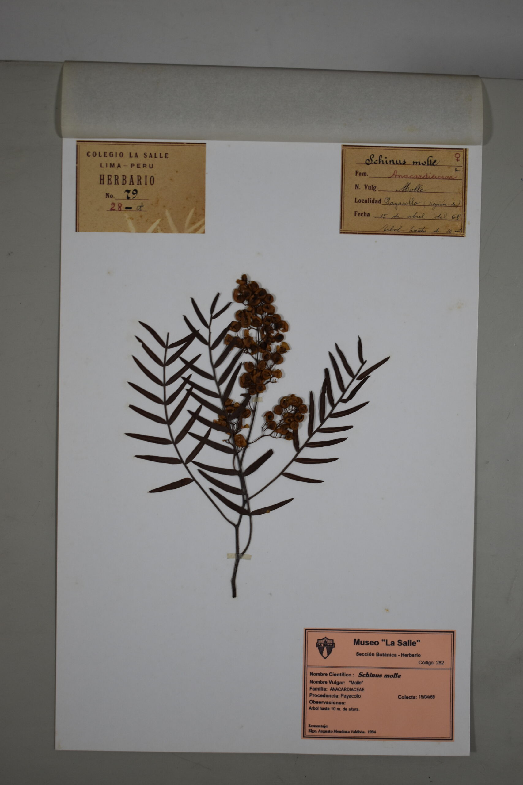 Este espécimen de nuestro Herbario pertenece a la familia Anacardiaceae y procede de Payacollo. Corresponde a la especie Schinus molle, conocida comúnmente como molle. Es un árbol de copa amplia y ramas colgantes, que puede alcanzar hasta 10 metros de altura. Sus hojas son compuestas y aromáticas, y sus frutos, de color rosado, se agrupan en racimos colgantes muy vistosos. El molle es valorado por su uso ornamental y medicinal, y por su capacidad para adaptarse a climas secos y suelos pobres, aportando sombra y estabilidad al terreno donde crece.