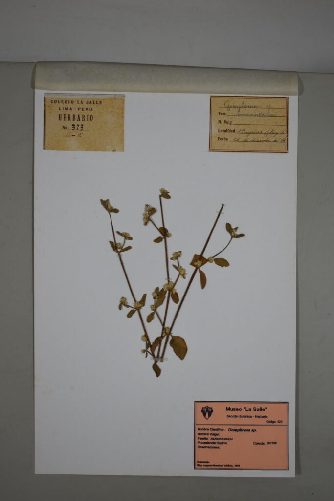 Este espécimen de nuestro Herbario pertenece a la familia Amaranthaceae y procede de Bujama. Corresponde al género Gomphrena sp., conformado