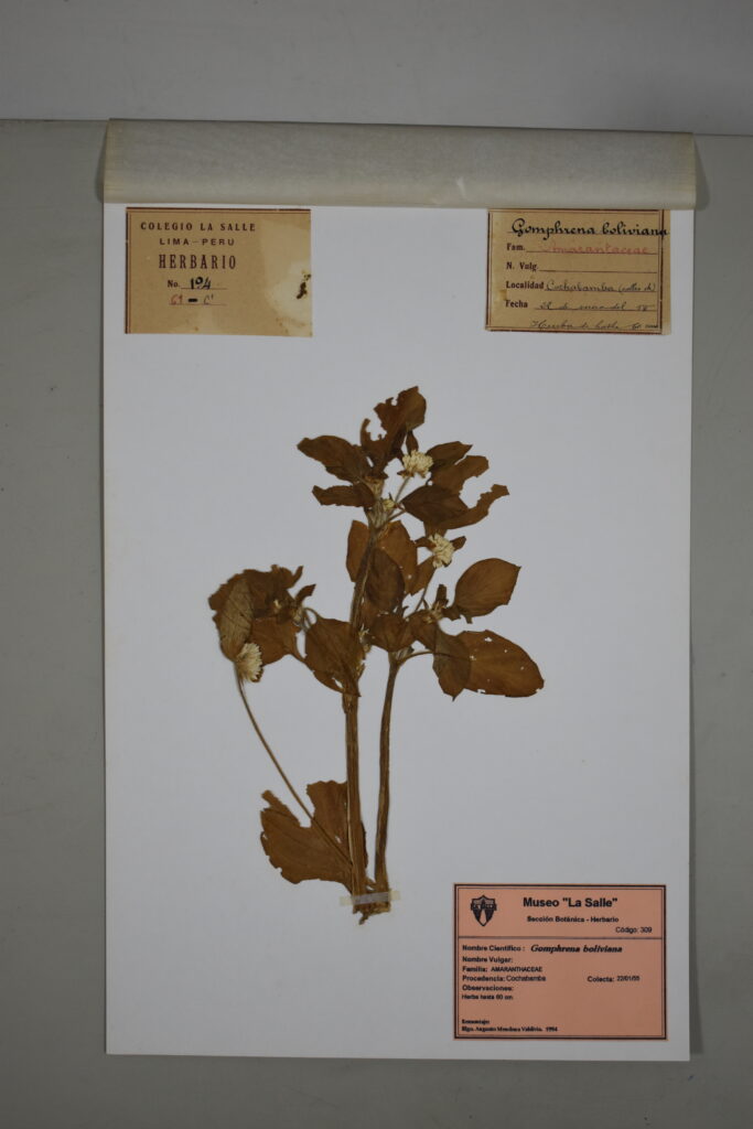 Este espécimen de nuestro Herbario pertenece a la familia Amaranthaceae y procede de Cochabamba. Corresponde a la especie Gomphrena boliviana,