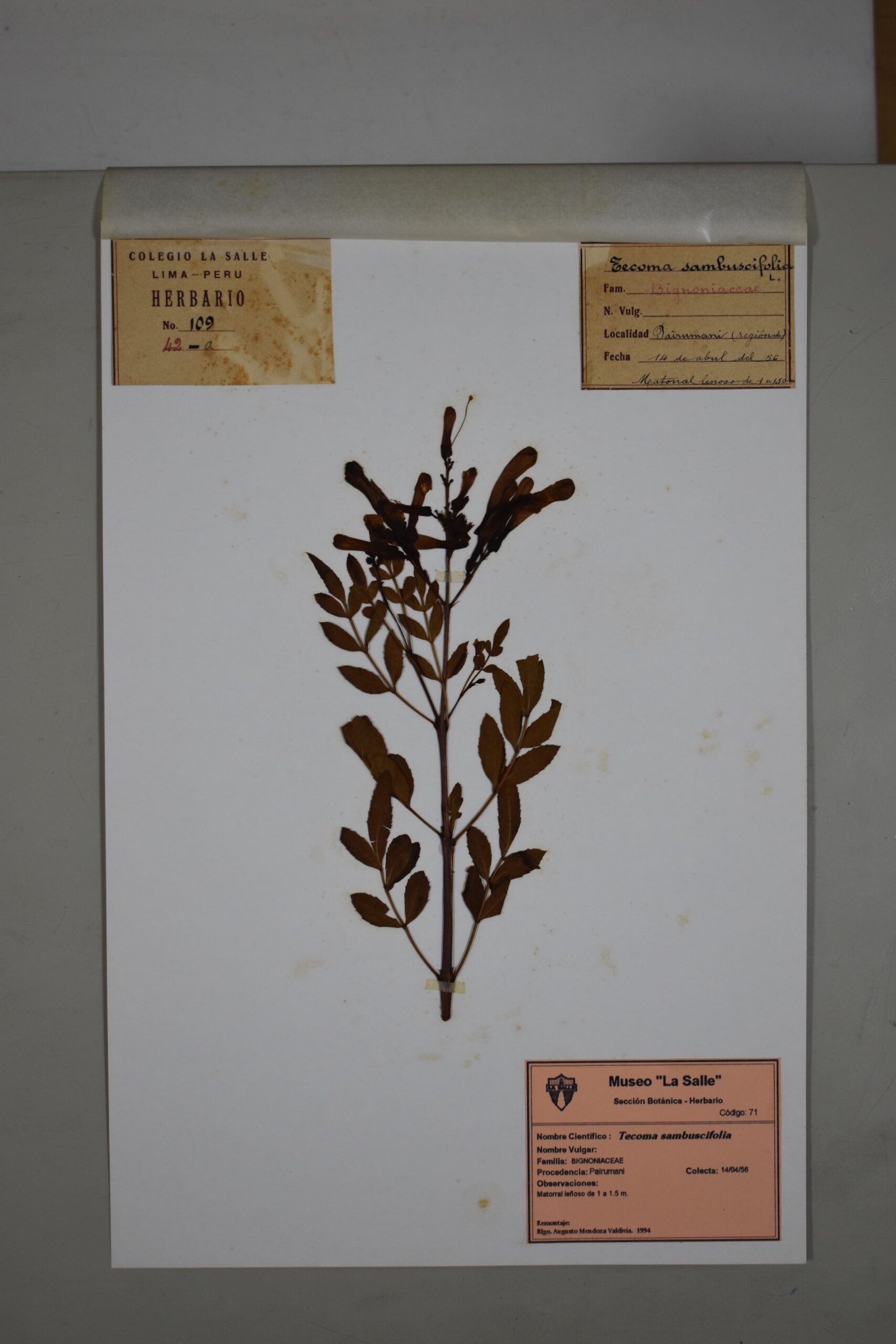 Este espécimen de nuestro Herbario pertenece a la familia Bignoniaceae y procede de Pairumani. Corresponde a la especie Tecoma sambucifolia, un arbusto o pequeño árbol de flores amarillas en forma de trompeta. Habita en zonas templadas y soleadas, y suele encontrarse en bordes de caminos o matorrales. Sus flores atraen a abejas y colibríes, participando activamente en la polinización de su entorno.