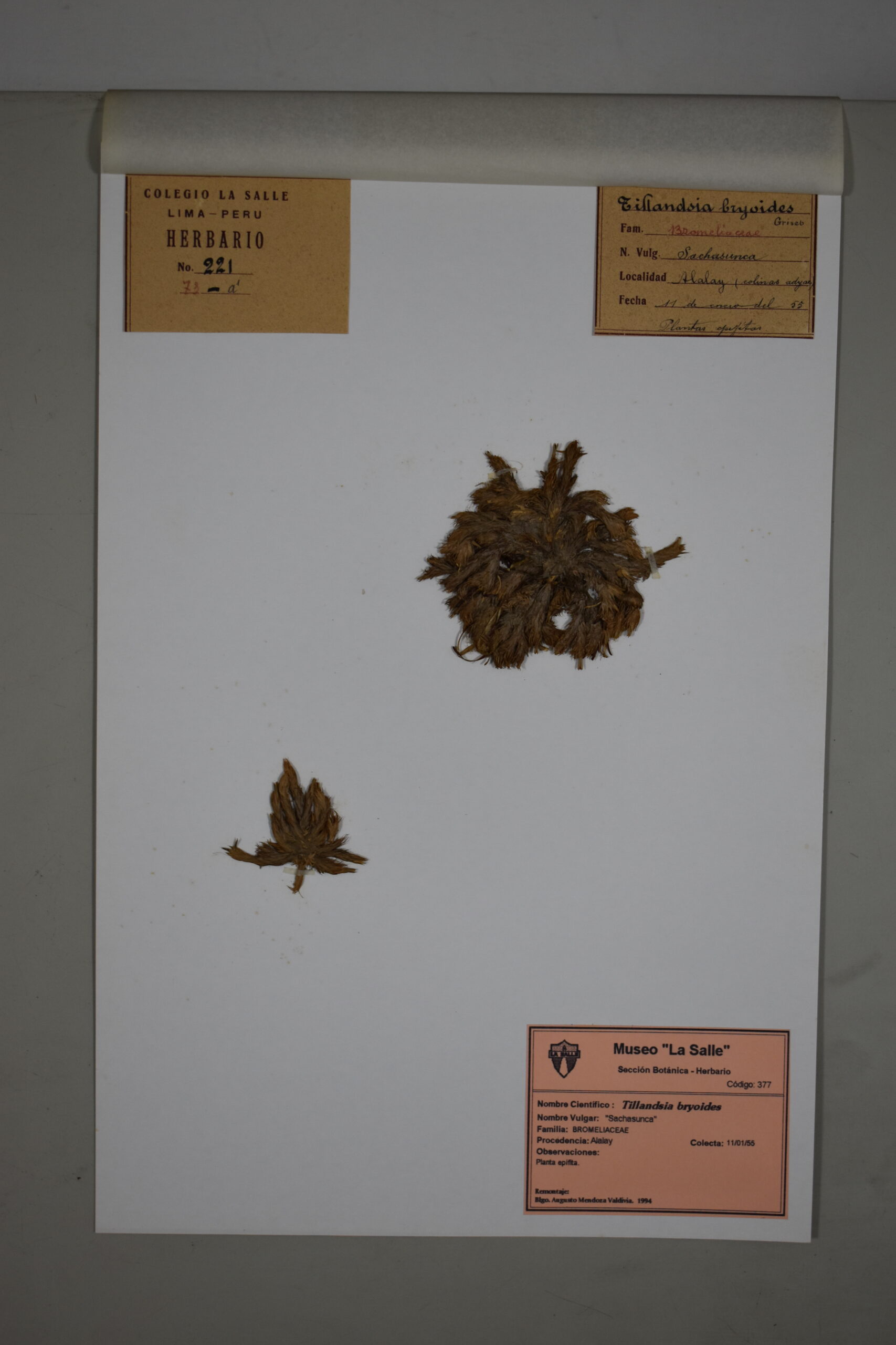 Este espécimen de nuestro Herbario pertenece a la familia Bromeliaceae y procede de Alalay. Corresponde a la especie Tillandsia bryoides, conocida comúnmente como sachasunca. Es una planta epífita de pequeño tamaño, con hojas finas y grisáceas que absorben la humedad del aire. Suele crecer sobre rocas o ramas expuestas al sol, formando densas colonias. Su capacidad de sobrevivir con escasa agua la convierte en una especie característica de ambientes secos y de alta montaña.